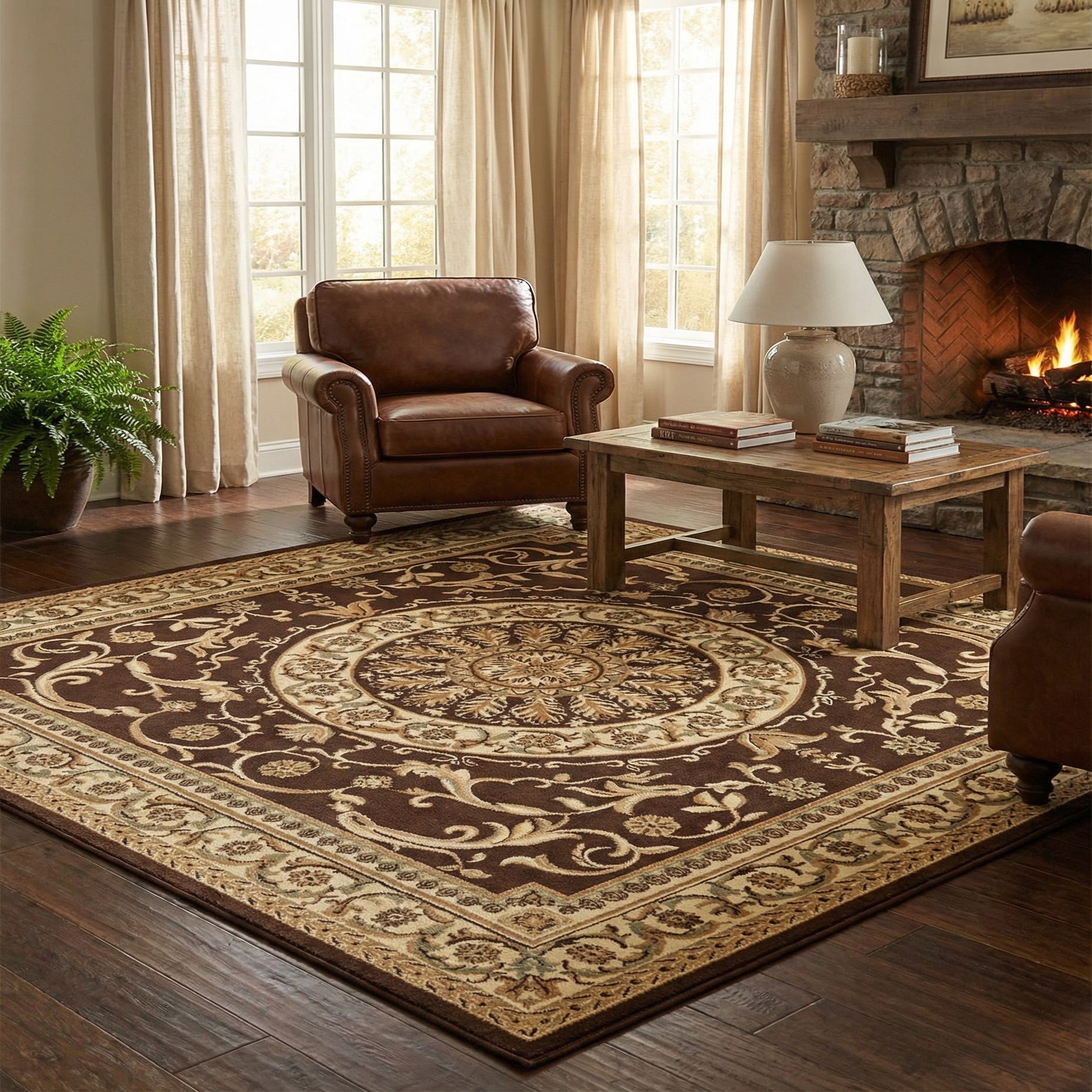 Classic medallion and vine motifs define this traditionally inspired area rug. A rich brown field provides the backdrop for an ornate central medallion in cream and tan, while light green highlights trace the scrolling floral vines and decorative border. The layered pattern and contrasting tones give the design clear definition and an elegant, time-honored feel.