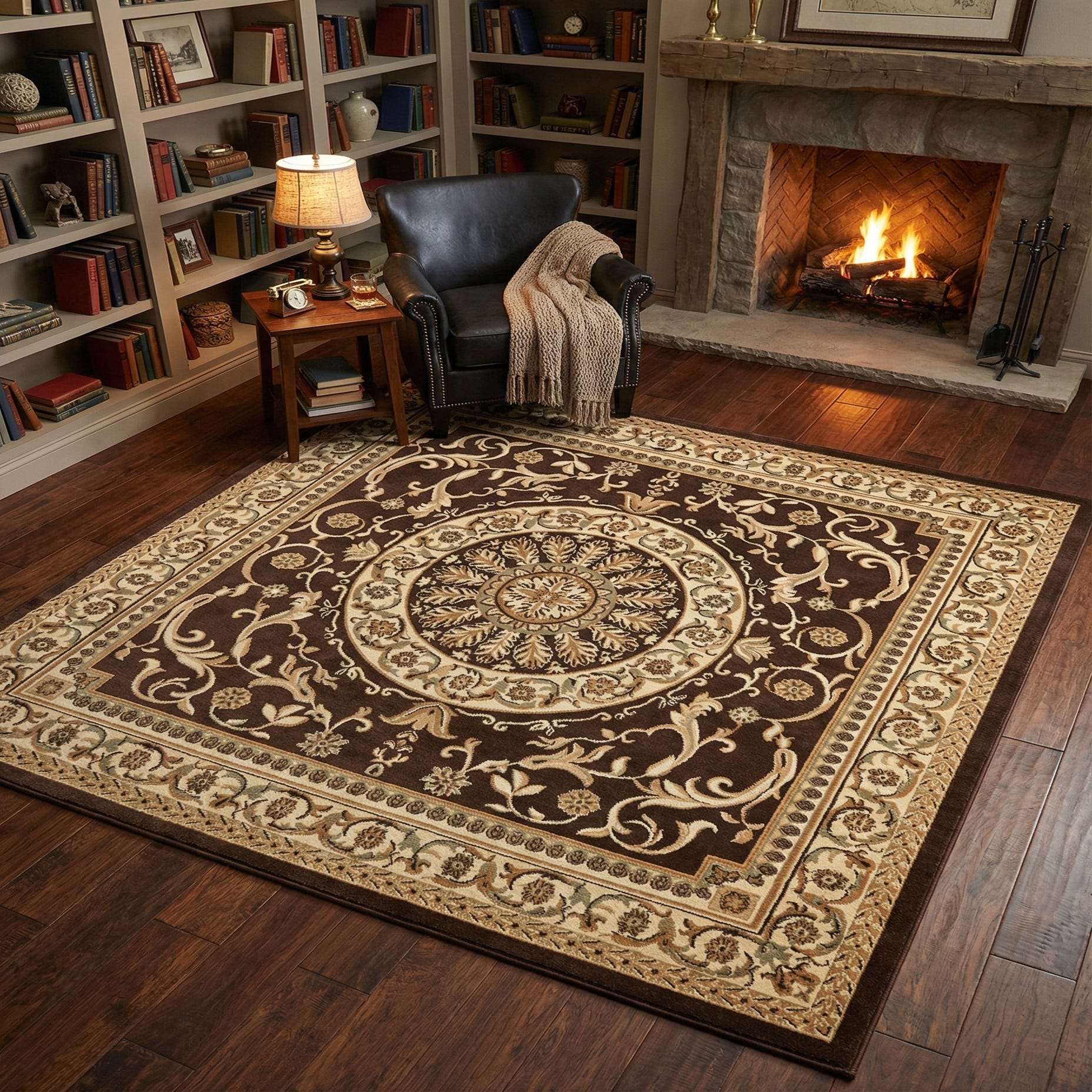 Machine made from 100% polypropylene, the rug has a dense, low-sheen pile that feels comfortable underfoot and presents the pattern with crisp detail. Its square format makes it a natural choice for anchoring a seating group, centering under a dining table, or adding a formal touch to a home office. Pair it with warm wood furniture, leather seating, and cream or tan upholstery for a cohesive traditional look, or use it in a transitional scheme with neutral walls and green accents to bridge classic and contemporary elements.