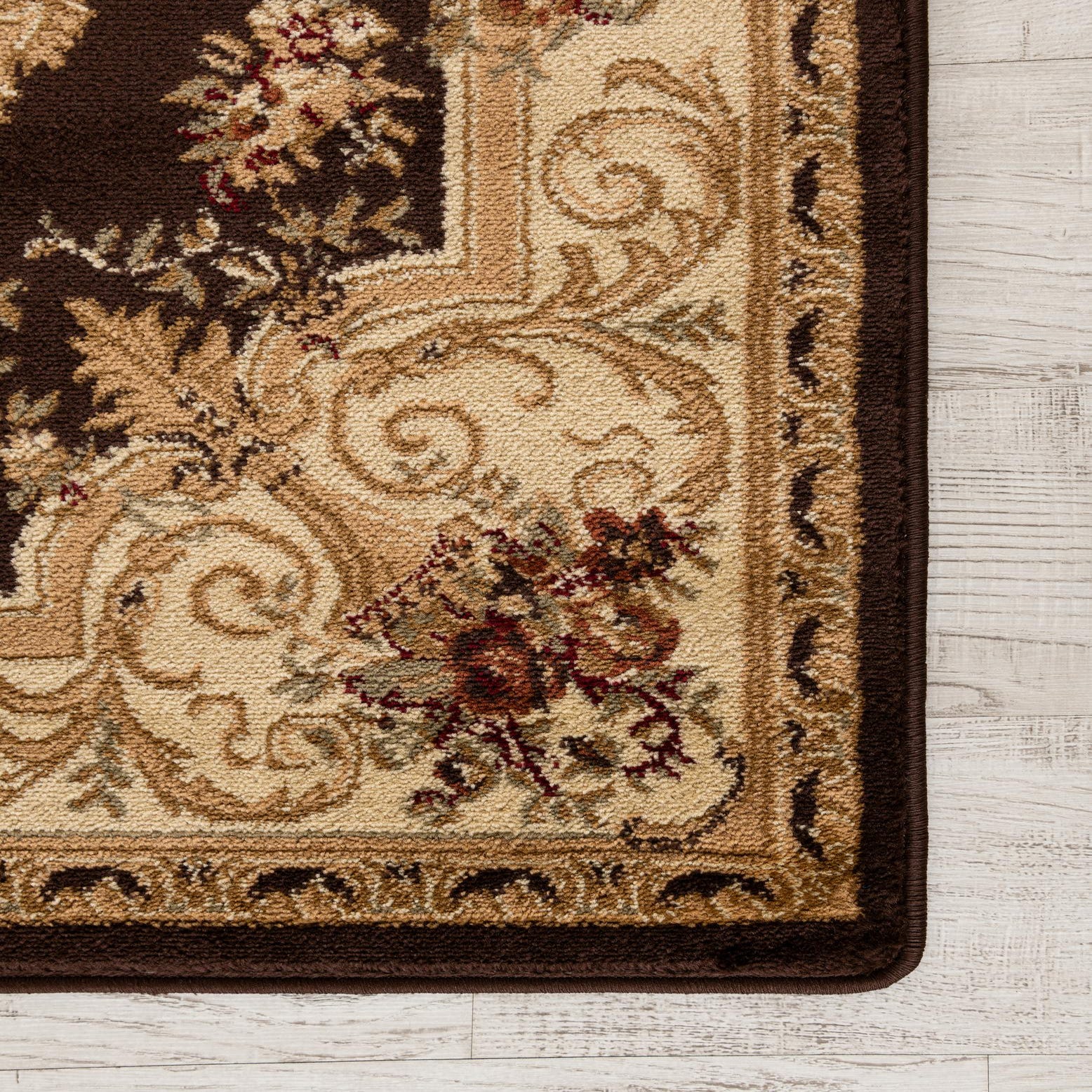 A classic medallion design sits at the center of this traditional area rug, surrounded by scrolling acanthus motifs and floral garlands that flow into corner sprays. The brown background anchors the composition while cream panels and tan highlights form layered borders, and touches of red appear in the bouquet details to add visual warmth. The overall pattern reads formal and balanced, with well-defined motifs and an elegant layout that complements traditional interiors.