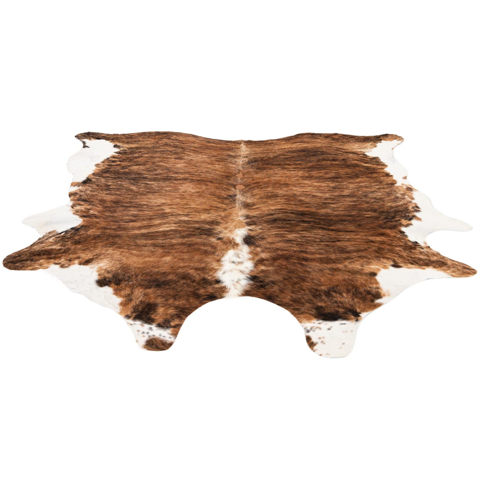 This hand-made cowhide and leather rug shows a natural, organic pattern with a rich brown background interrupted by streaks of black and patches of ivory along the edges. The hair-on-hide surface has a short, velvety nap that feels soft underfoot and has a gentle directional sheen that highlights the subtle striations and tonal shifts across the hide. The irregular, freeform outline and central spine of lighter hair give the piece a grounded, authentic look that reads as an honest leather accent rather than a uniform area rug.
