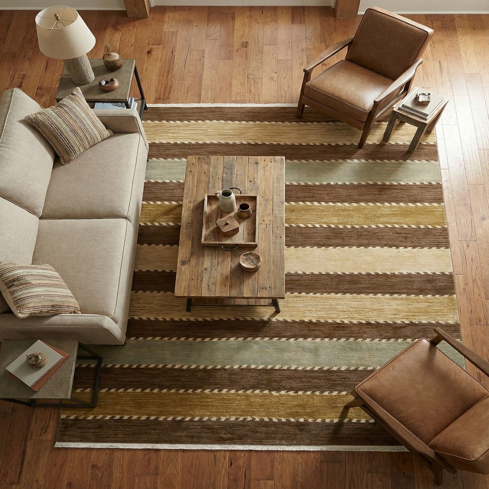 This striped design works well as an anchor for a relaxed living room or den, layered beneath a coffee table and the front legs of seating, or as a cozy foundation in a casual dining area. It pairs naturally with warm wood furniture, leather or linen upholstery and natural accents like woven baskets or jute—suiting transitional, modern-rustic and farmhouse interiors that favor earthy palettes and understated pattern.