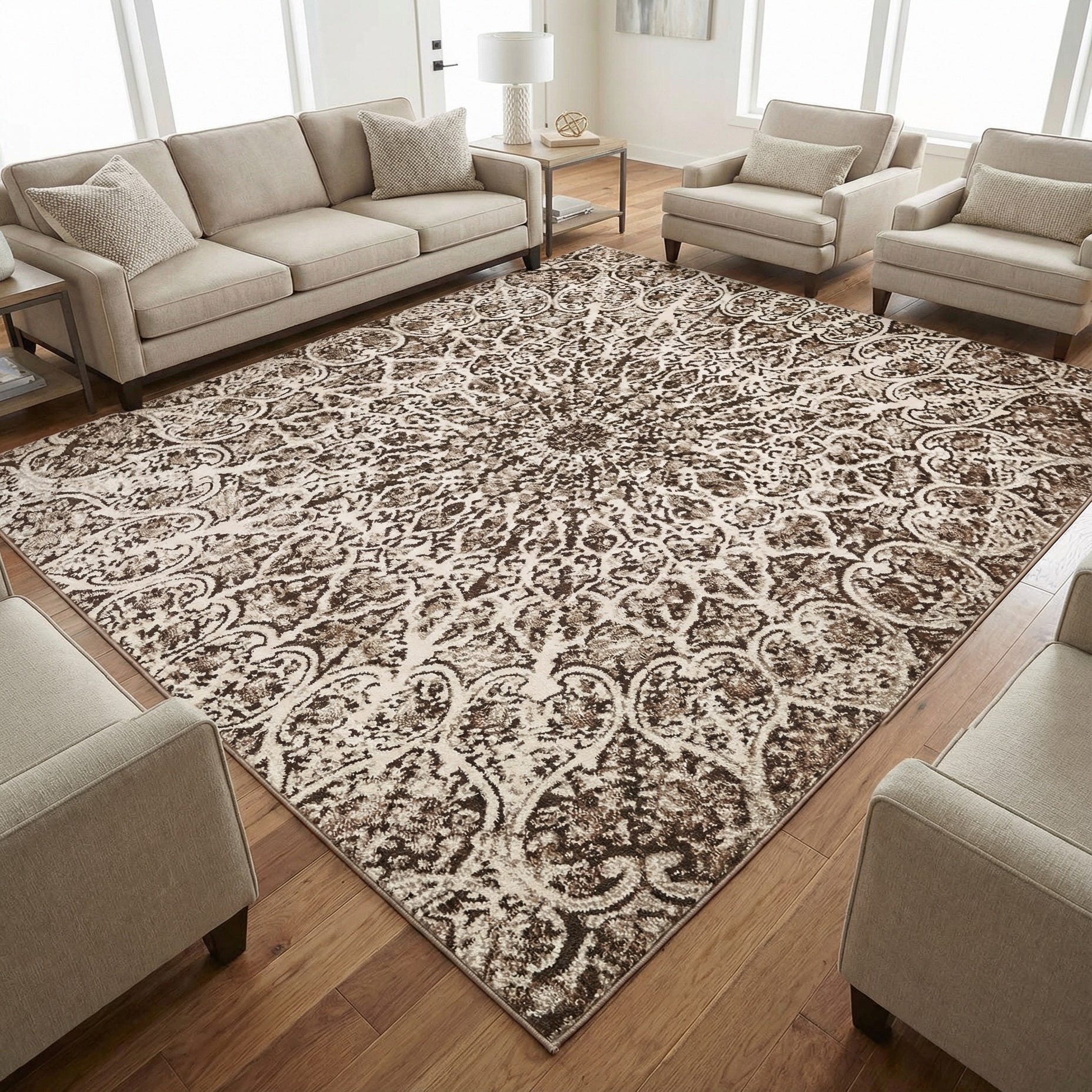 An ornate, radial medallion takes center stage in this rug, where a sunburst of scrolling arabesque motifs and lace-like filigree radiates to the edges. The deep brown background provides a warm foundation while ivory and light brown accents define the pattern, offering visible depth and a balanced contrast. Machine made from 100% polypropylene, the surface has a soft, slightly dense hand and a low-to-medium pile that highlights the design while remaining structured underfoot.