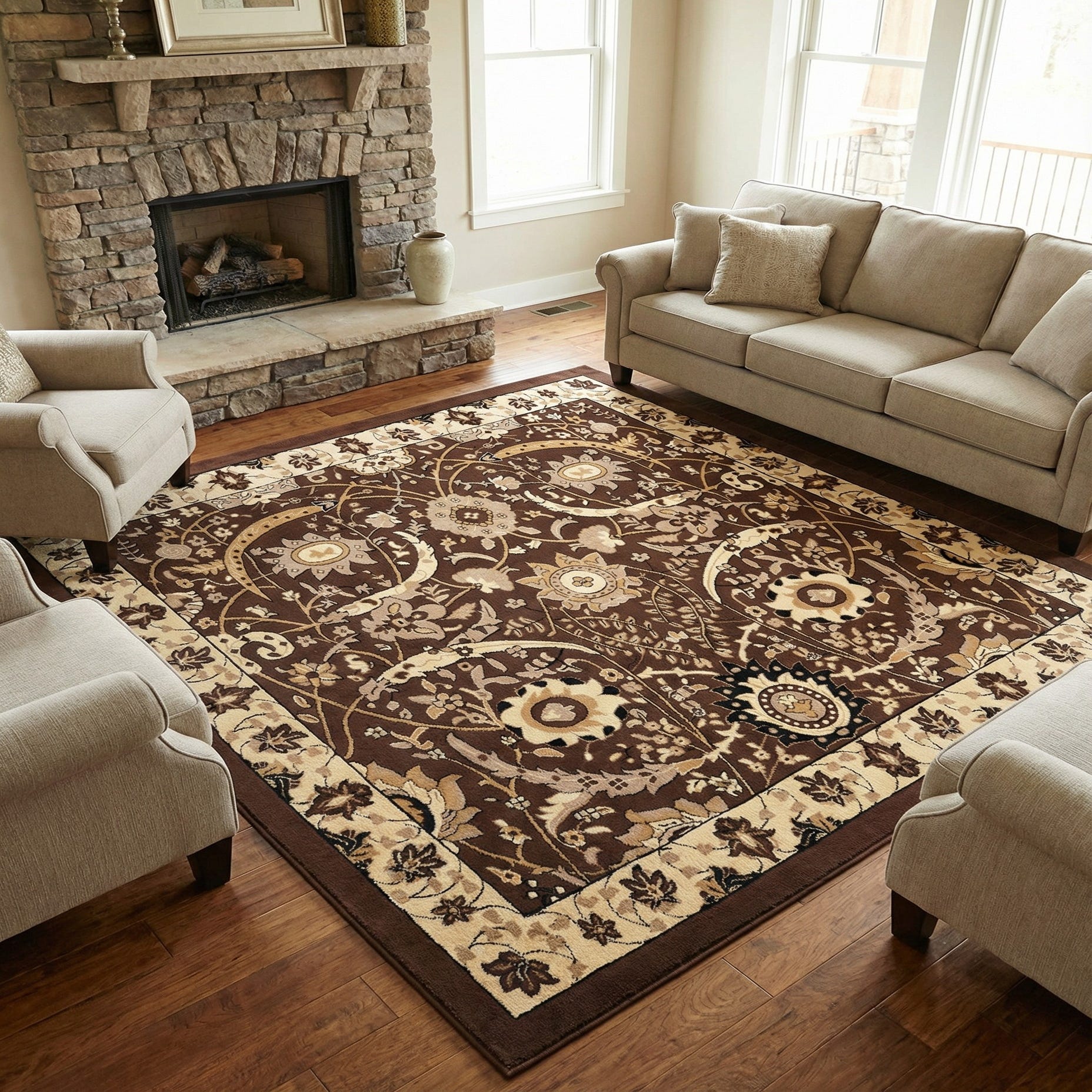 A rich brown background sets the stage for a traditional floral and vine motif that fills this square rug. Symmetrical palmettes and scrolling stems form a central medallion-like arrangement, while smaller blossoms and leaf sprigs weave through the field. A cream and beige inner border frames the design, punctuated with touches of black that add contrast and definition. Machine-made from 100% polypropylene, the surface has a low-profile, dense pile that feels smooth and slightly cushioned underfoot.