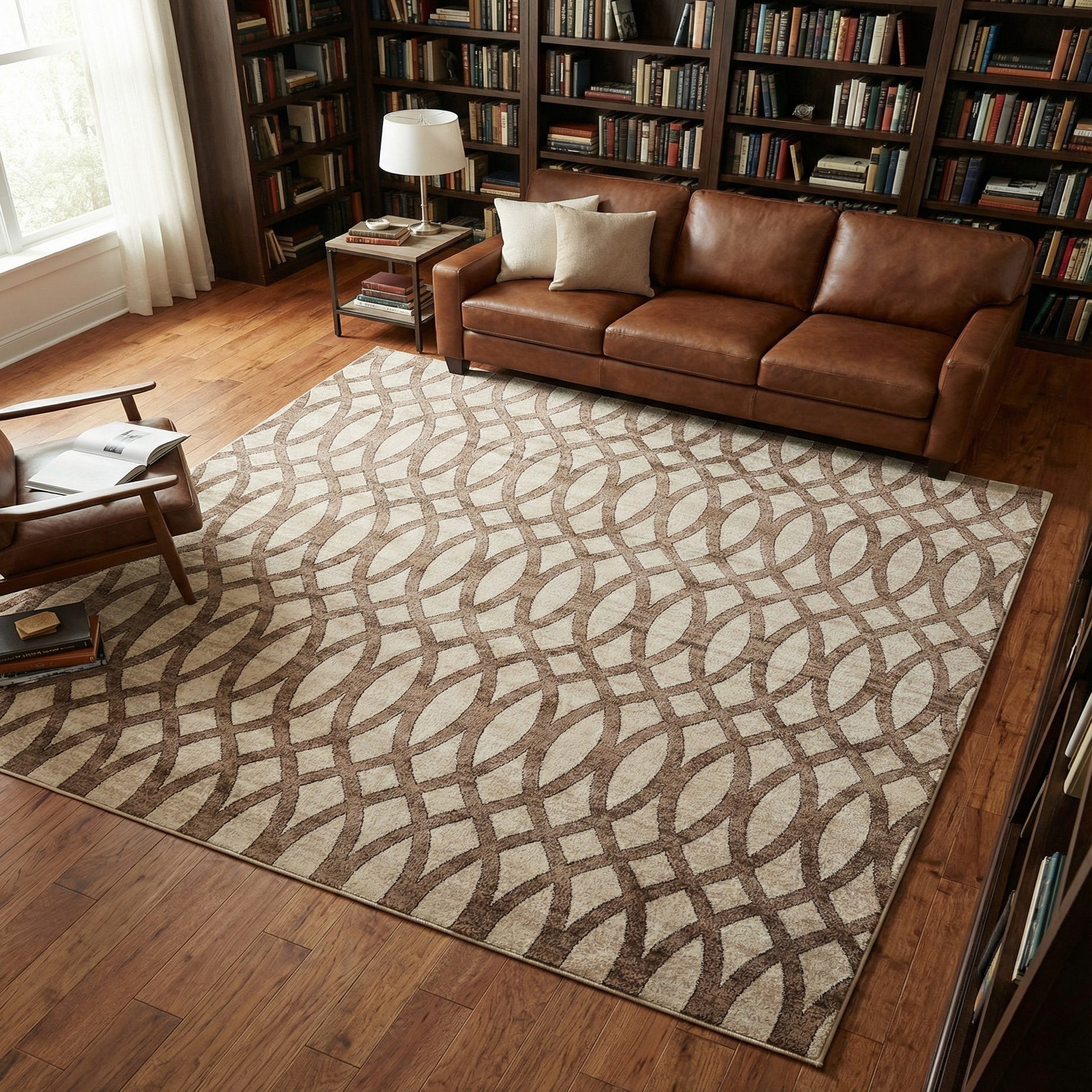 A repeating trellis of interlocking ovals crosses a warm brown ground, the pattern defined in soft beige and light-brown hues for a layered, geometric look. Machine-made from 55% polypropylene and 45% polyester, the rug has a low-sheen surface with the patterned areas sitting slightly higher than the background, creating a gentle, tactile dimension you can feel underfoot. The overall style leans transitional, bridging classic lattice motifs with a contemporary colorway that complements a range of interiors.