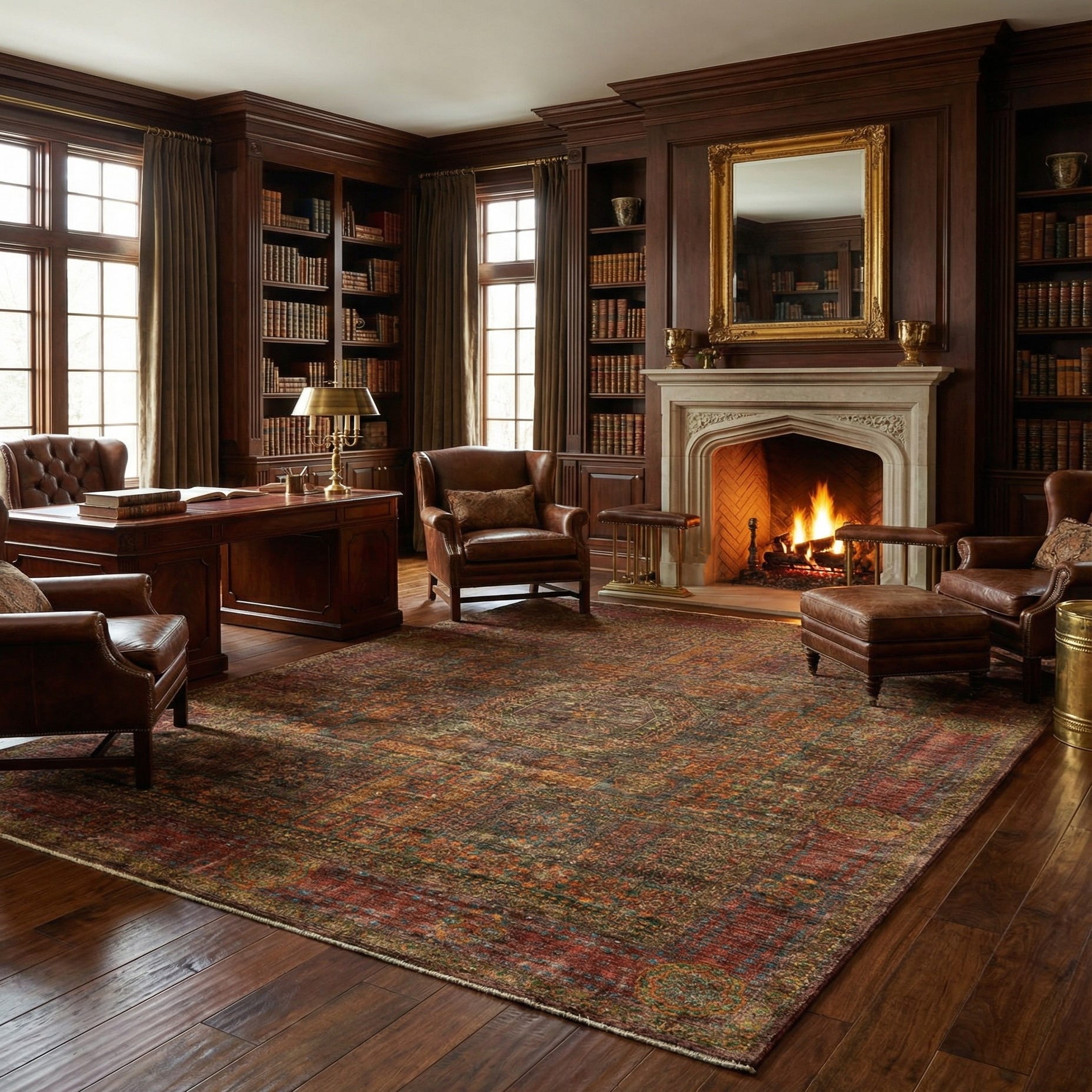 A rectangular 8x10 Amina Persian rug in rich browns and tans with intricate traditional patterns, suitable for a living room.