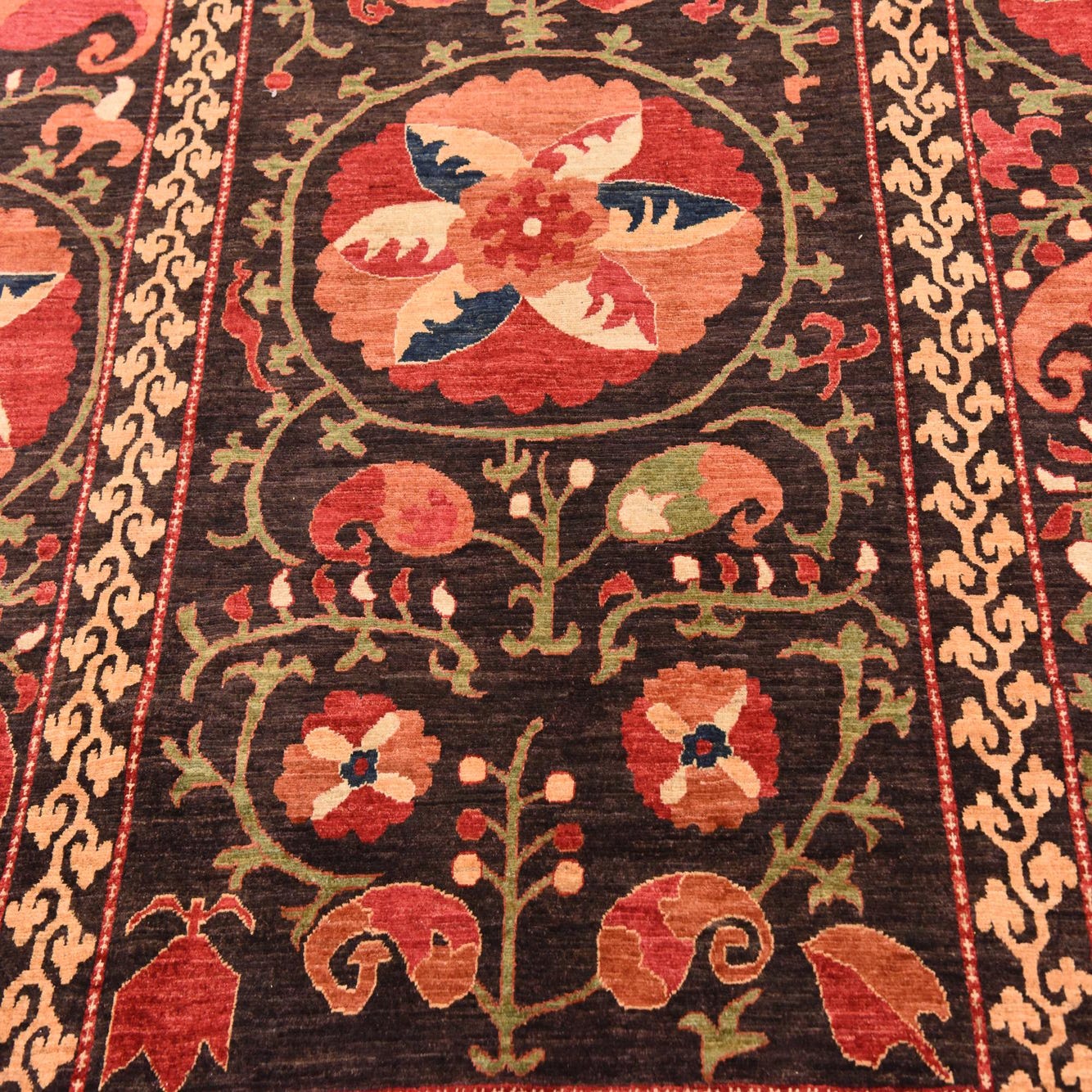Primary color is Brown. Colors in this rug include: Brown, Cream, Green, Navy Blue, Red, Salmon, Olive, Gold.