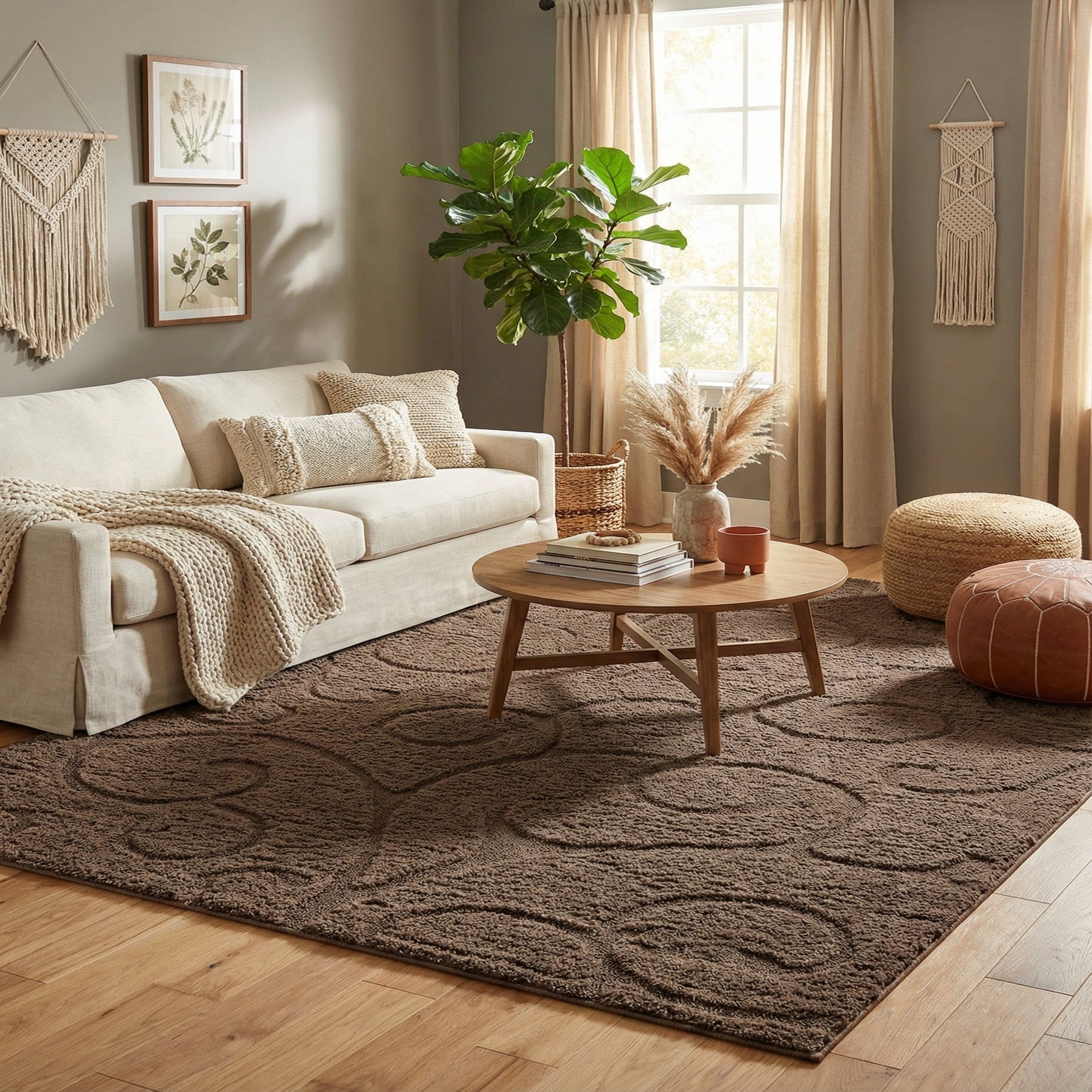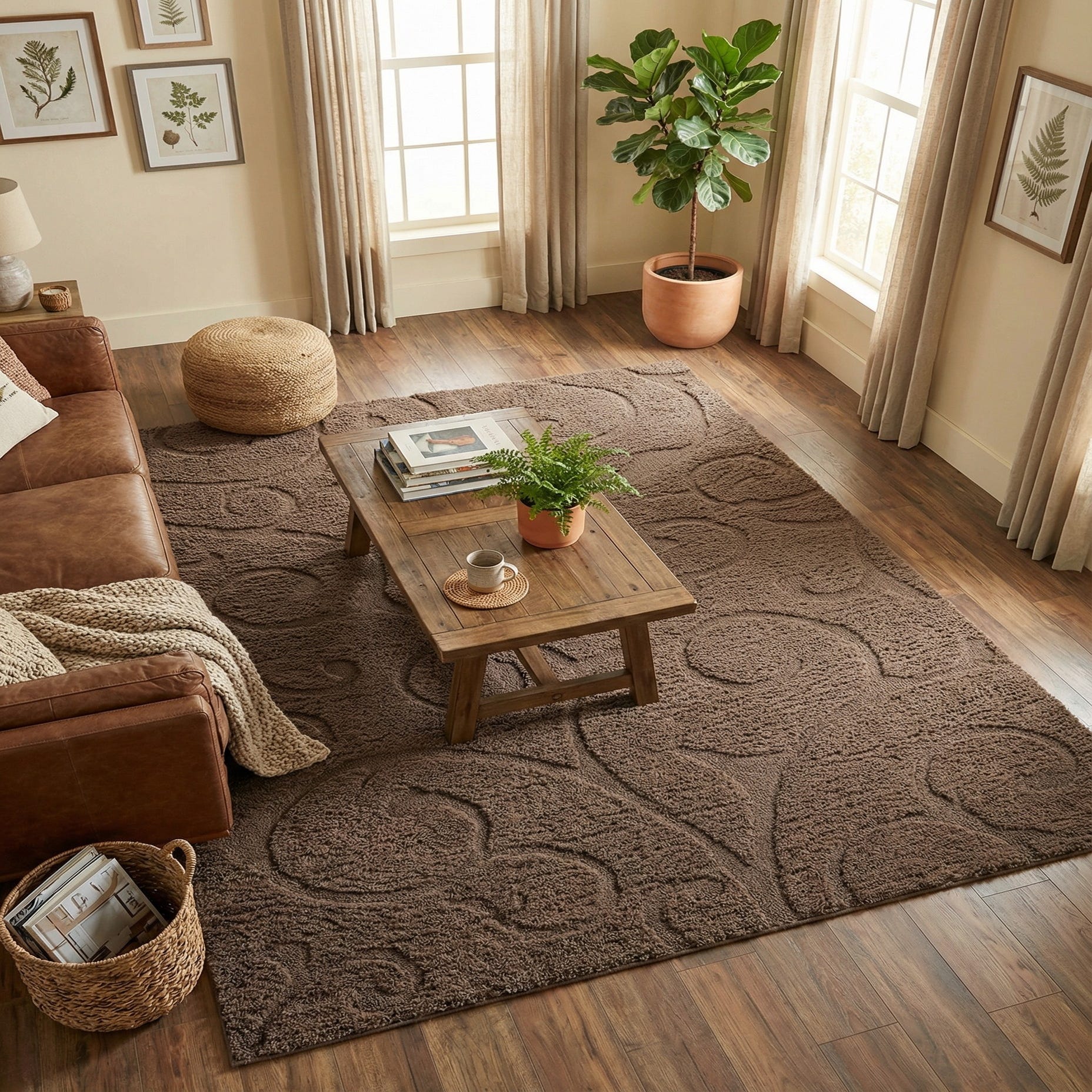 This piece pairs naturally with warm wood tones, leather seating, and woven accents, bringing a grounded, organic feel to a room. It works best anchoring a living room seating group, layered under a bed for added comfort, or placed in a den or home office to introduce softness and pattern without overpowering the space. The tonal brown palette and botanical motif suit contemporary, transitional, and relaxed rustic interiors that favor texture and understated pattern.