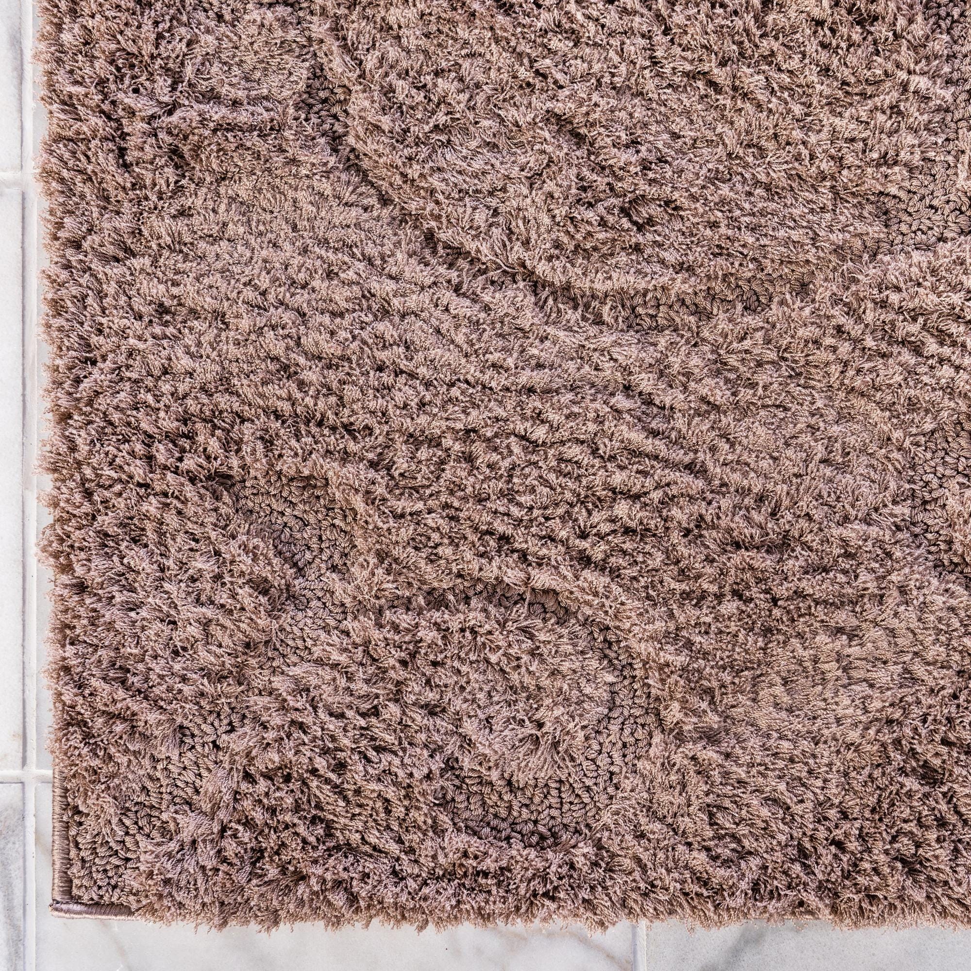 A warm, brown field is gently sculpted with large botanical scrolls and looping vine motifs, created by variations in pile height that give the surface subtle depth and movement. The shag profile invites touch, with plush, higher tufts contrasted by lower, sheared areas that form the raised pattern and a soft, tactile hand. Machine made from 100% polyester, the rug has a consistent pile and a low luster that keeps the overall look understated and textural.