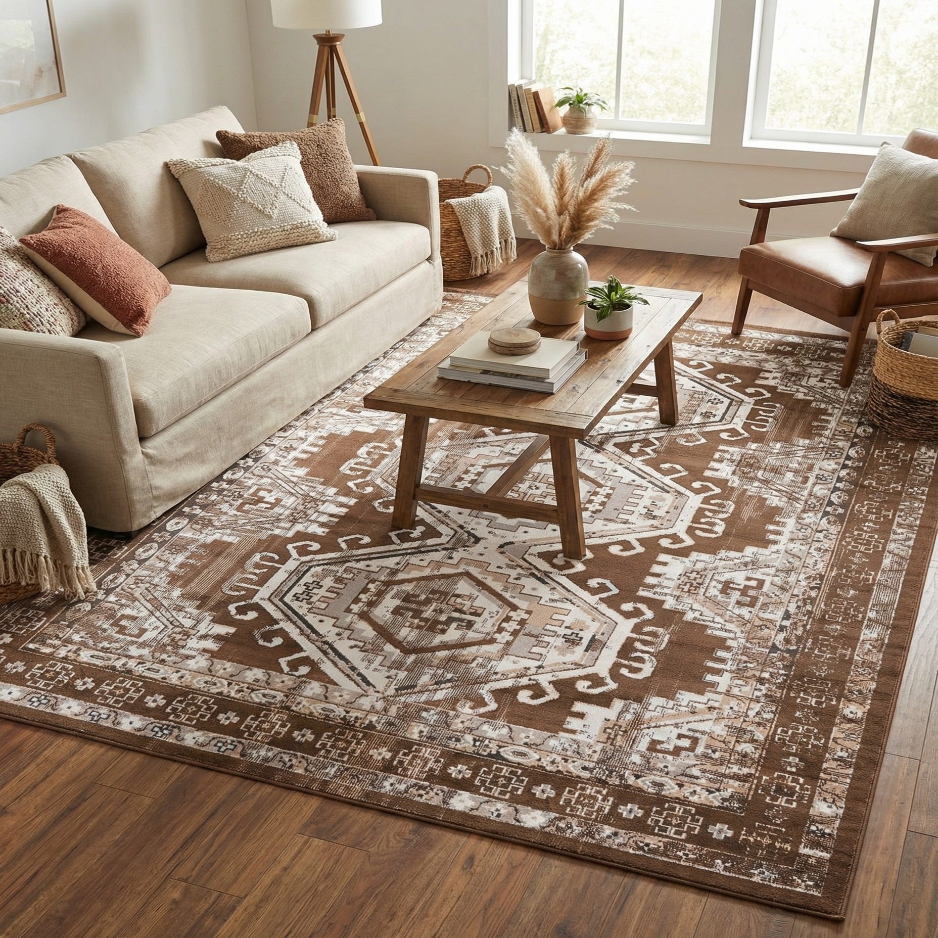 This rug works well in transitional and rustic-modern interiors where warm neutrals and layered textures are desired. Use it to anchor a seating area beneath a leather sofa and wooden coffee table, set under a dining table to introduce pattern without overwhelming the room, or place it in a home office to bring warmth to hardwood or tile floors. Pair with linen or cream upholstery, warm wood tones, and matte metal accents for a balanced, cohesive look.