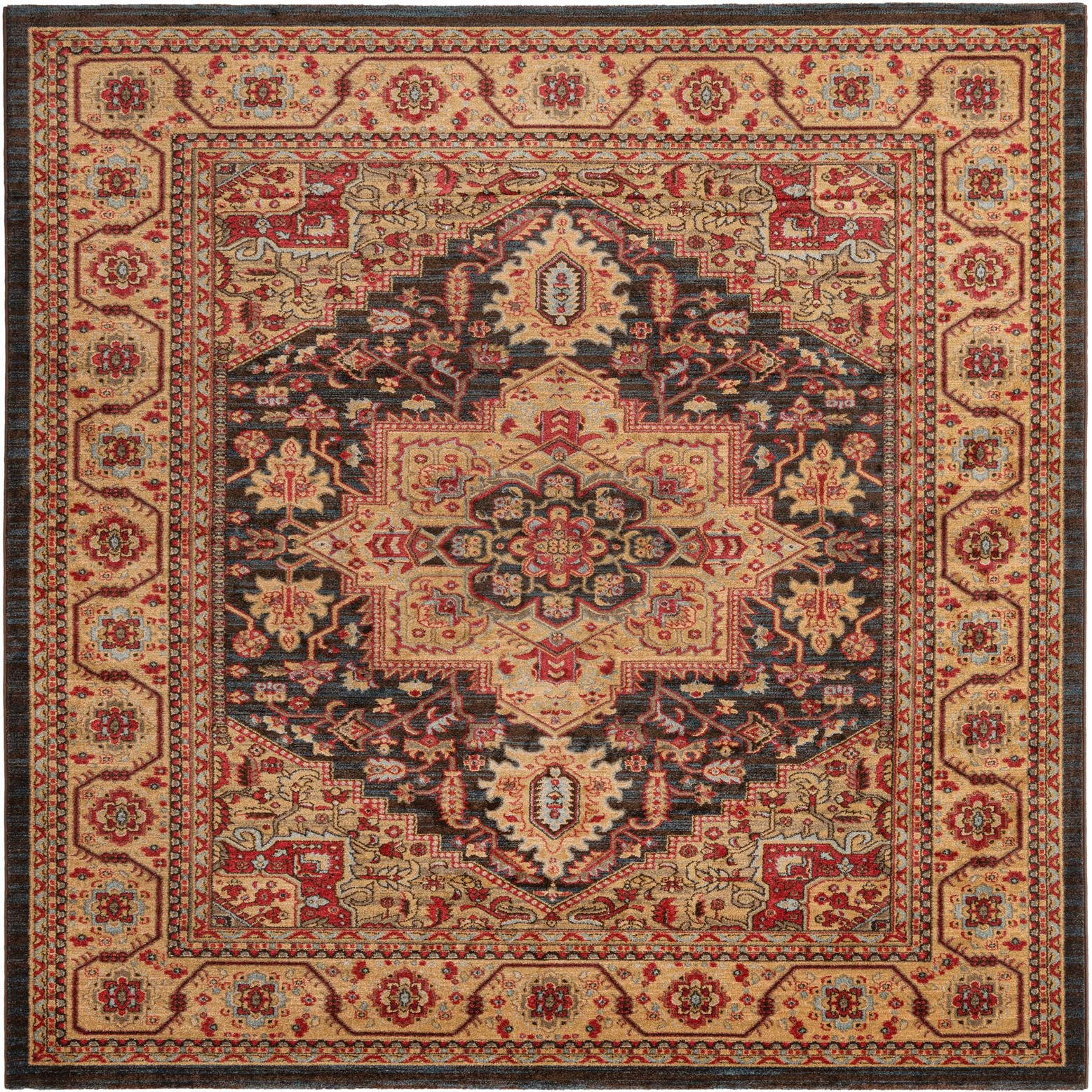 Primary color is Brown. Colors in this rug include: Brown, Beige, Black, Red, Blue.
