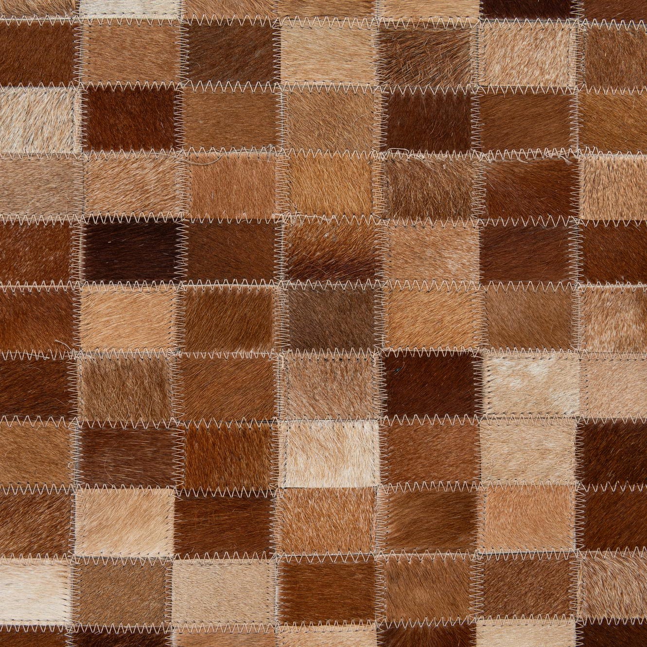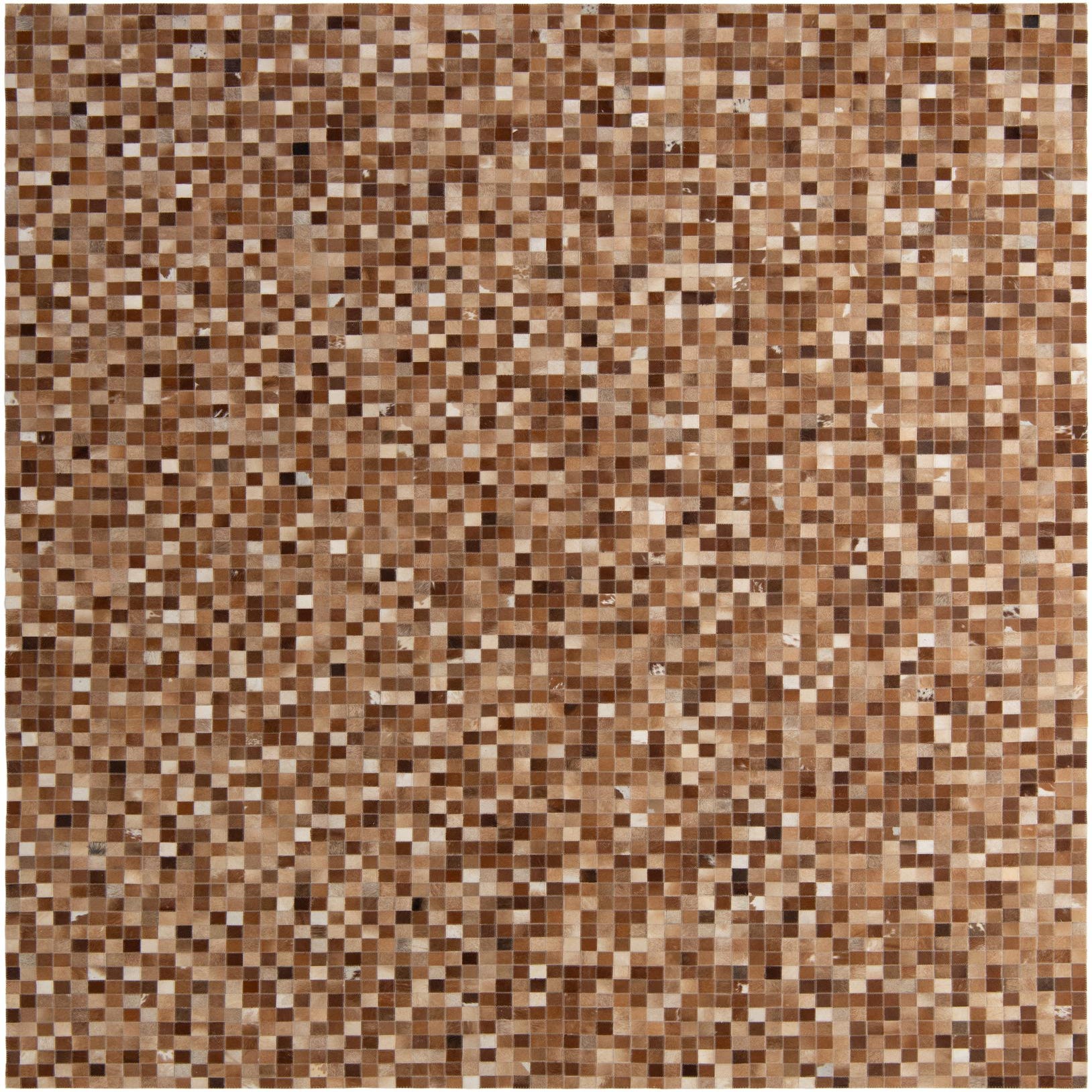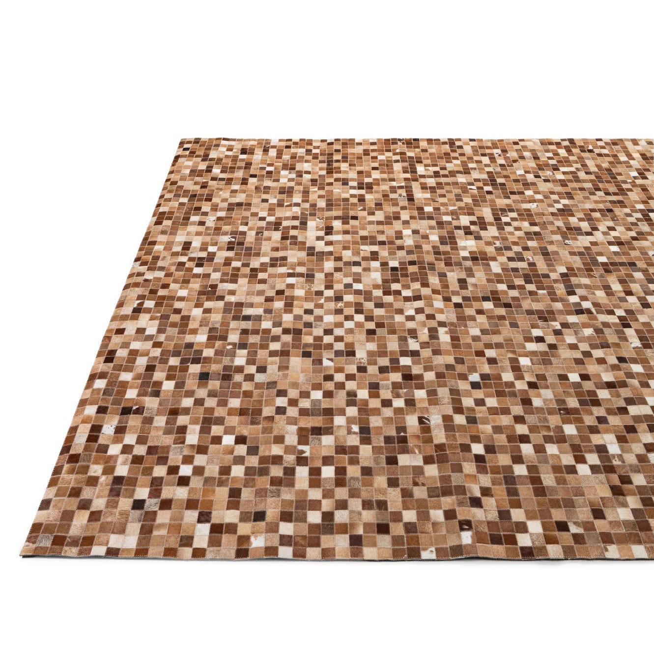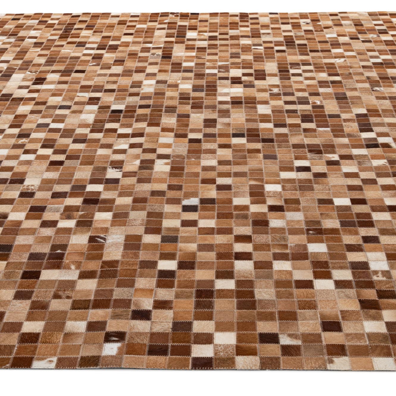A rectangular 8x10 brown and tan patchwork cowhide rug with a modern pixelated design, suitable for a living room.