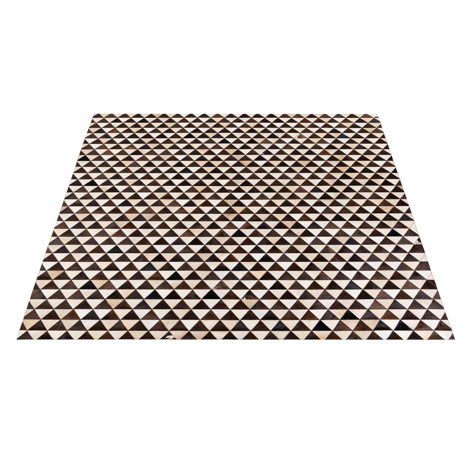 A rectangular 8x10 Cowhide Stocks rug featuring a modern geometric pattern of alternating brown and tan triangles.