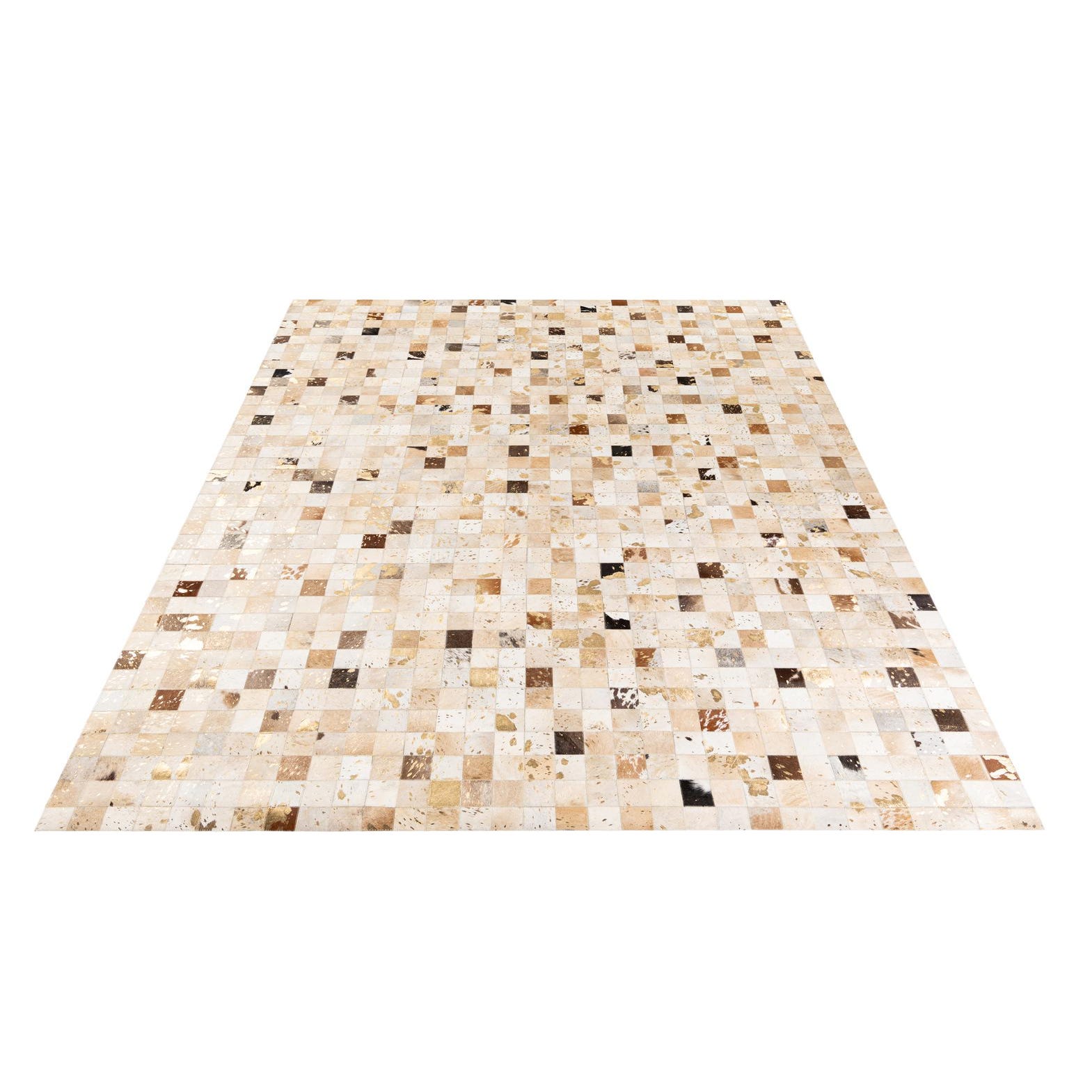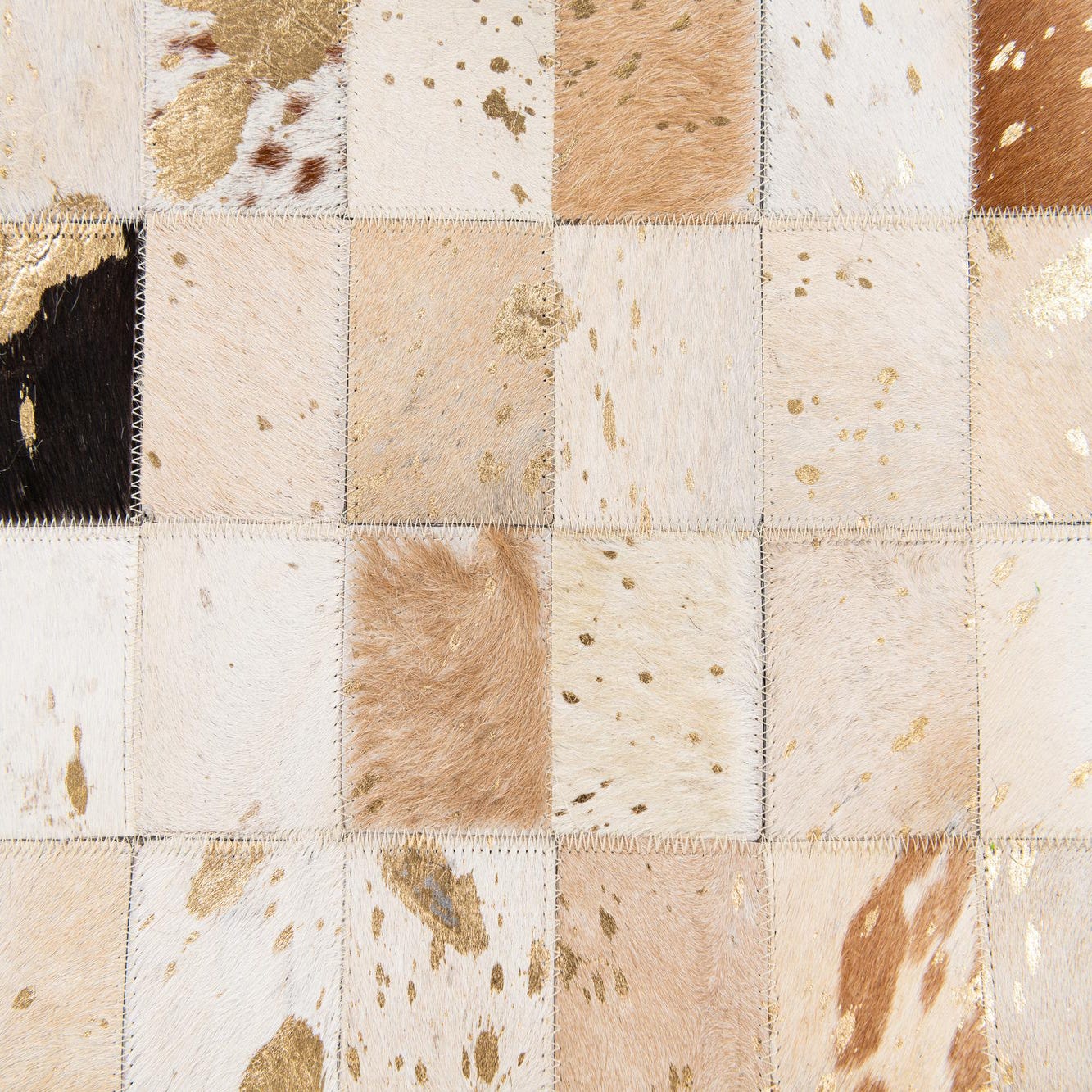 A rectangular 8x10 cowhide rug featuring a patchwork of brown, tan, and cream squares with metallic gold accents.