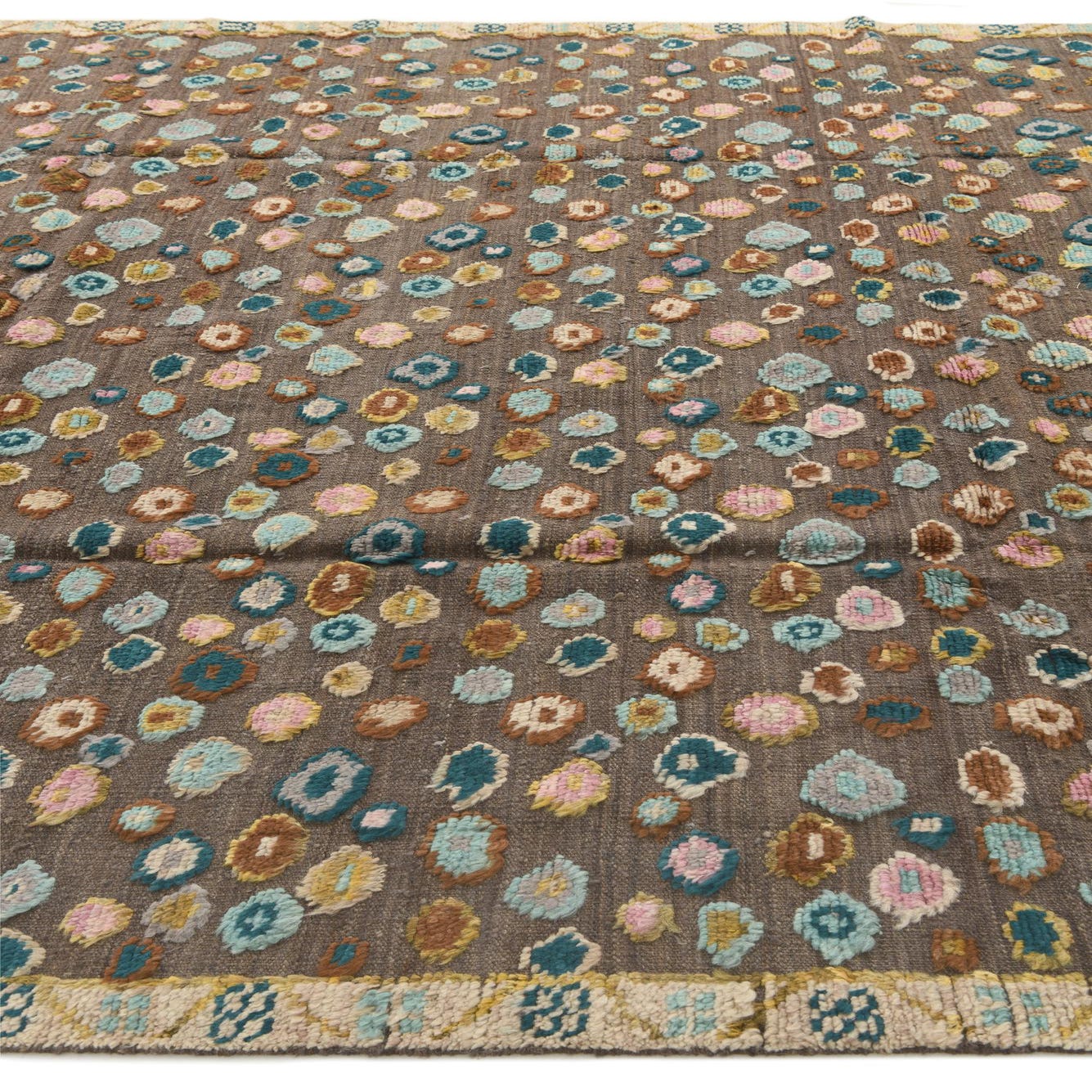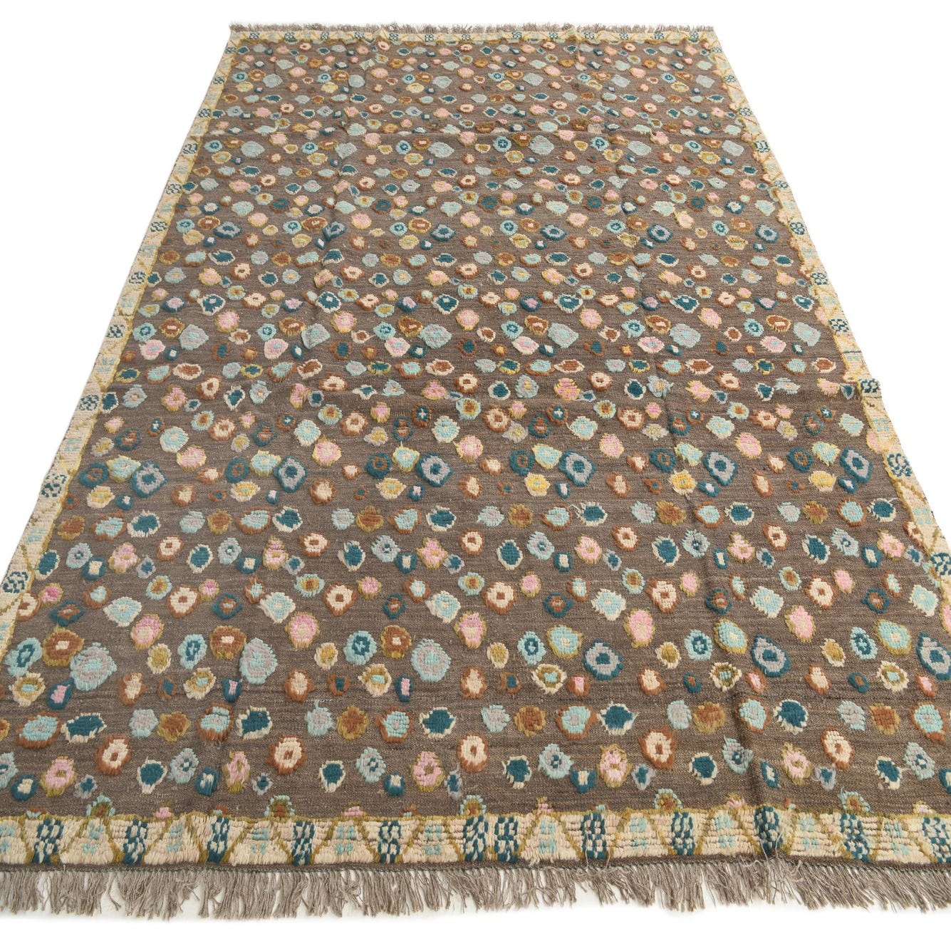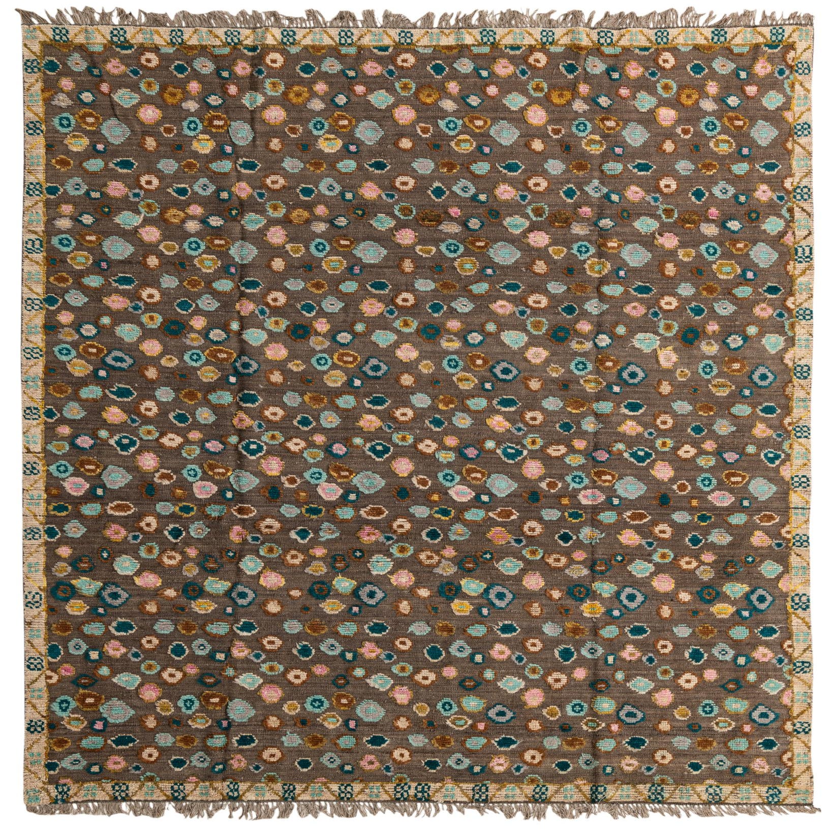A hand-knotted, 100% wool rug with a warm brown field, this piece features an all-over pattern of irregular, pebble-like medallions in blue, light blue, green, light green, beige and ivory. The scattered motifs create a casual, organic rhythm across the surface while a narrow, patterned border in beige and ivory frames the composition. Fringed ends and the slight irregularity of the knots give the rug a handcrafted character that adds visual depth without competing with other design elements.