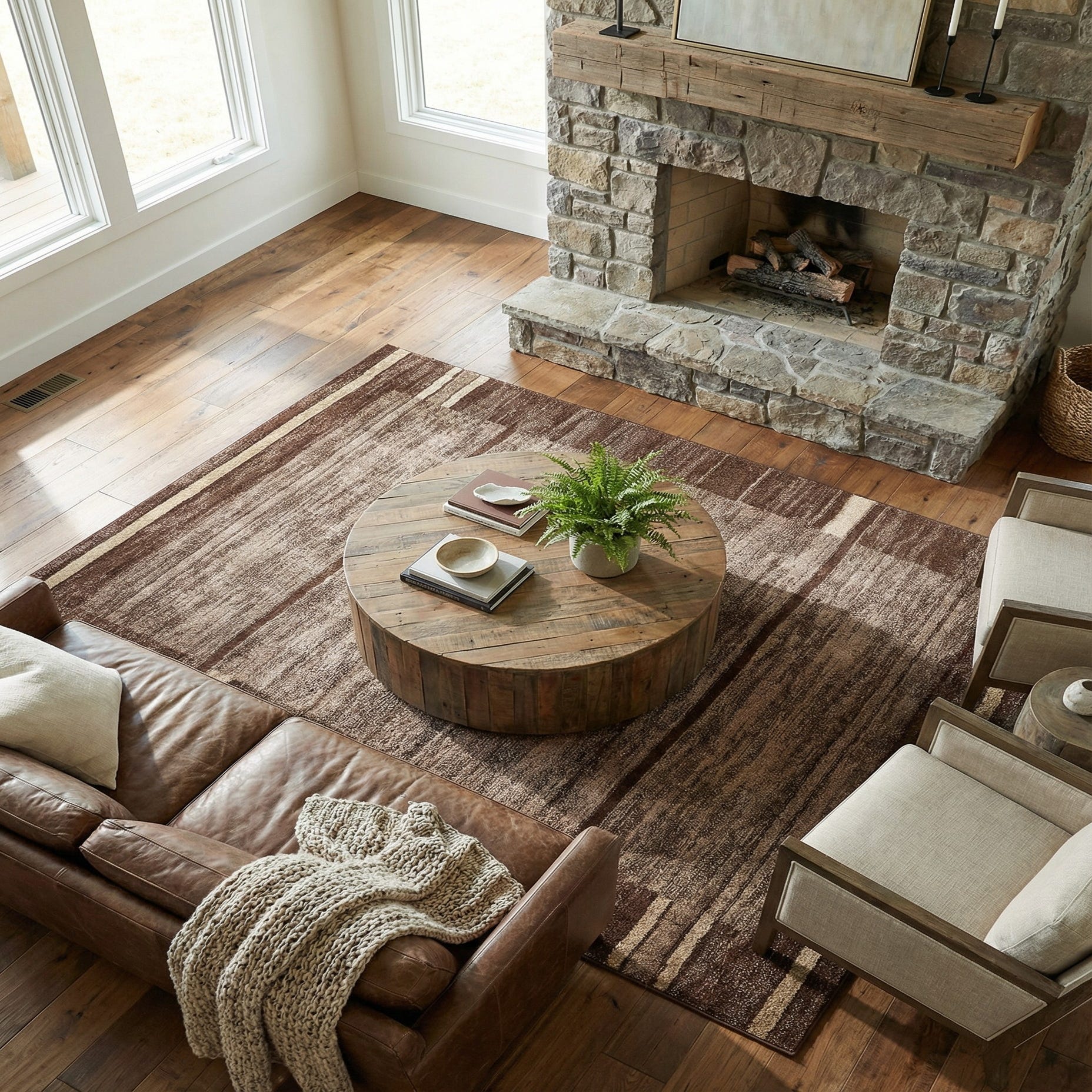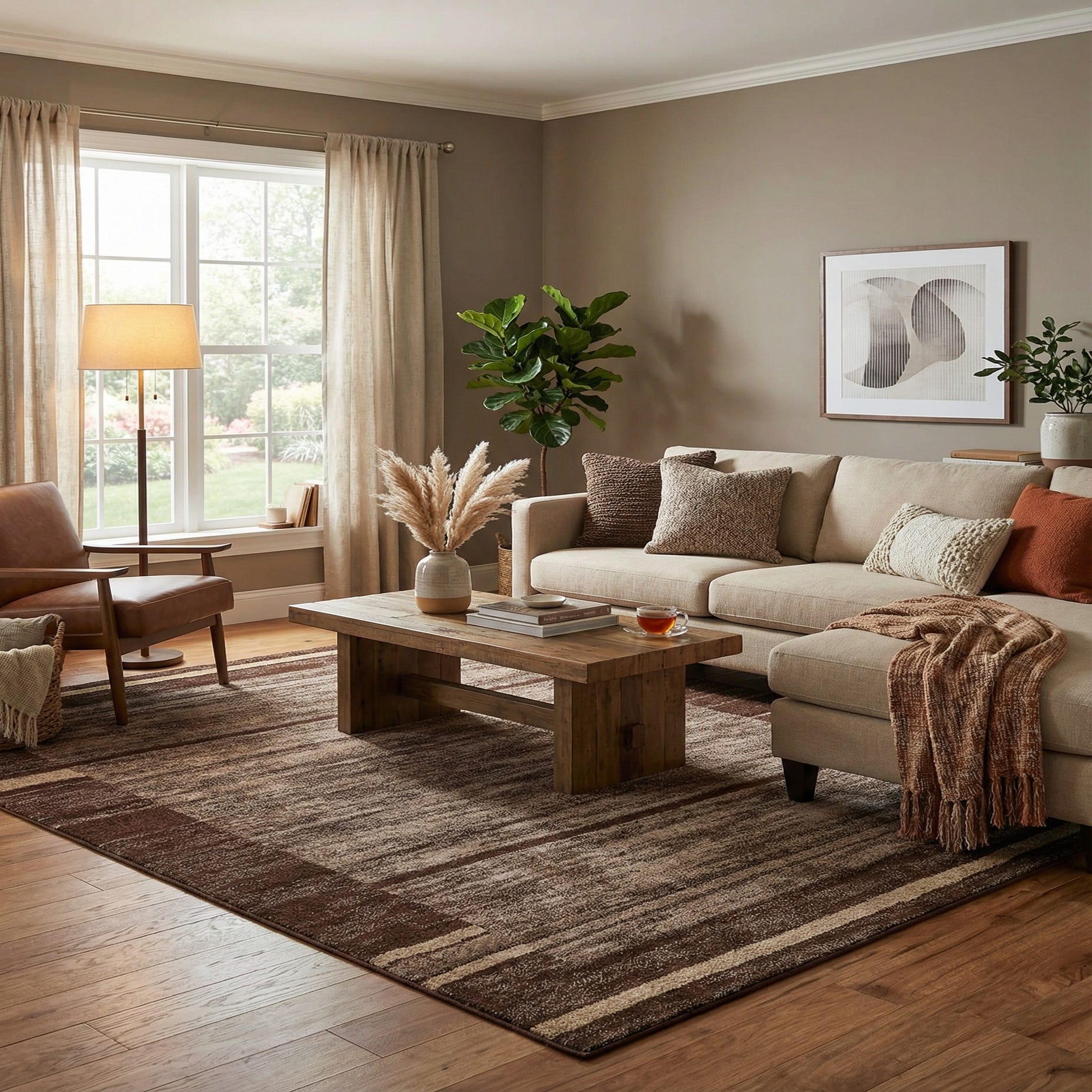 The colorway and clean lines make this rug well suited to contemporary or transitional interiors—place it beneath a leather sofa and wood coffee table to warm a living room, or center it under a dining table to ground a neutral seating group. It also works nicely in a home office or bedroom to introduce texture and cohesion over hardwood or tile floors, and can be layered with a smaller patterned rug for added interest.