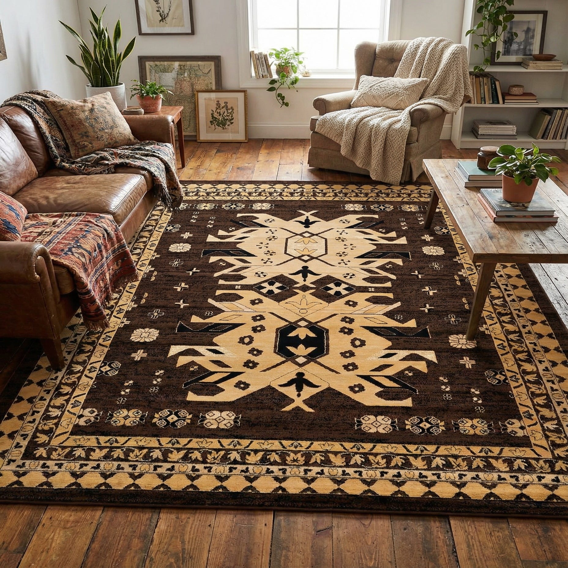 This rug works well as an anchor in a warm living room—place it beneath a sofa and coffee table to ground leather seating and walnut or oak furnishings. It also suits a dining area or home office where traditional patterning balances streamlined furniture, and it pairs nicely with neutral upholstery, black metal accents, or brass lighting for a layered, collected look. Use it to add warmth and structure to rustic, transitional, or contemporary interiors that benefit from a strong, patterned focal point.