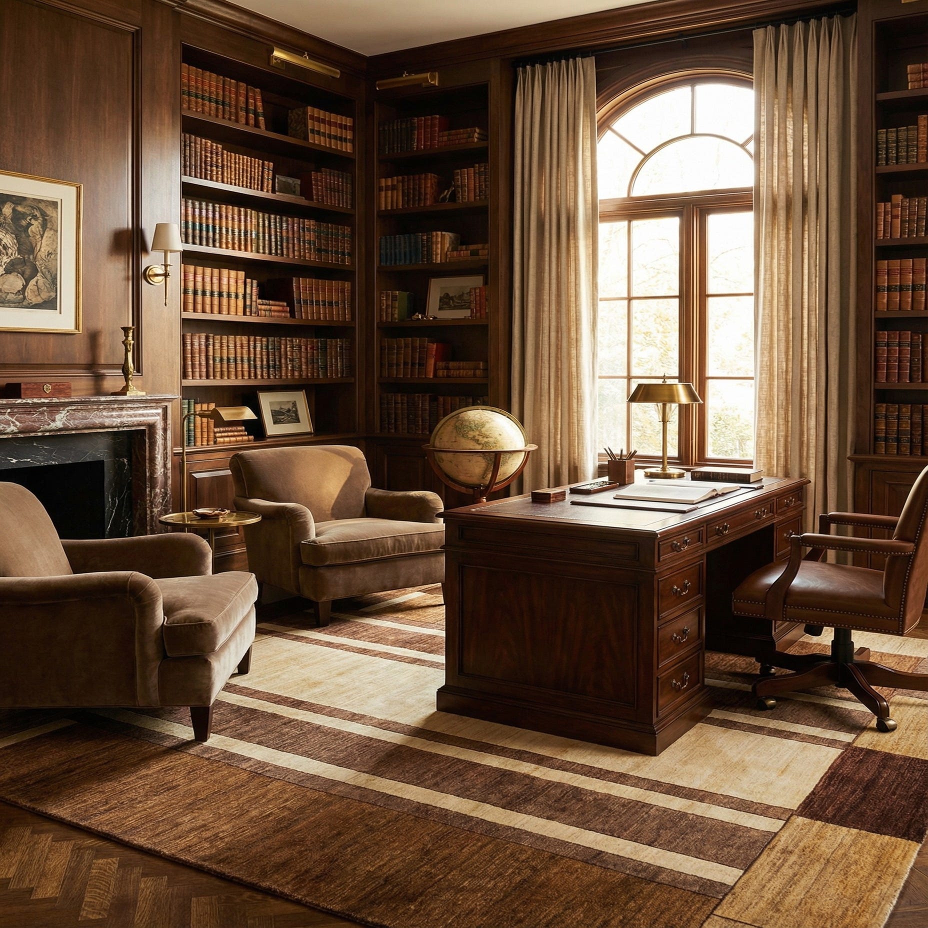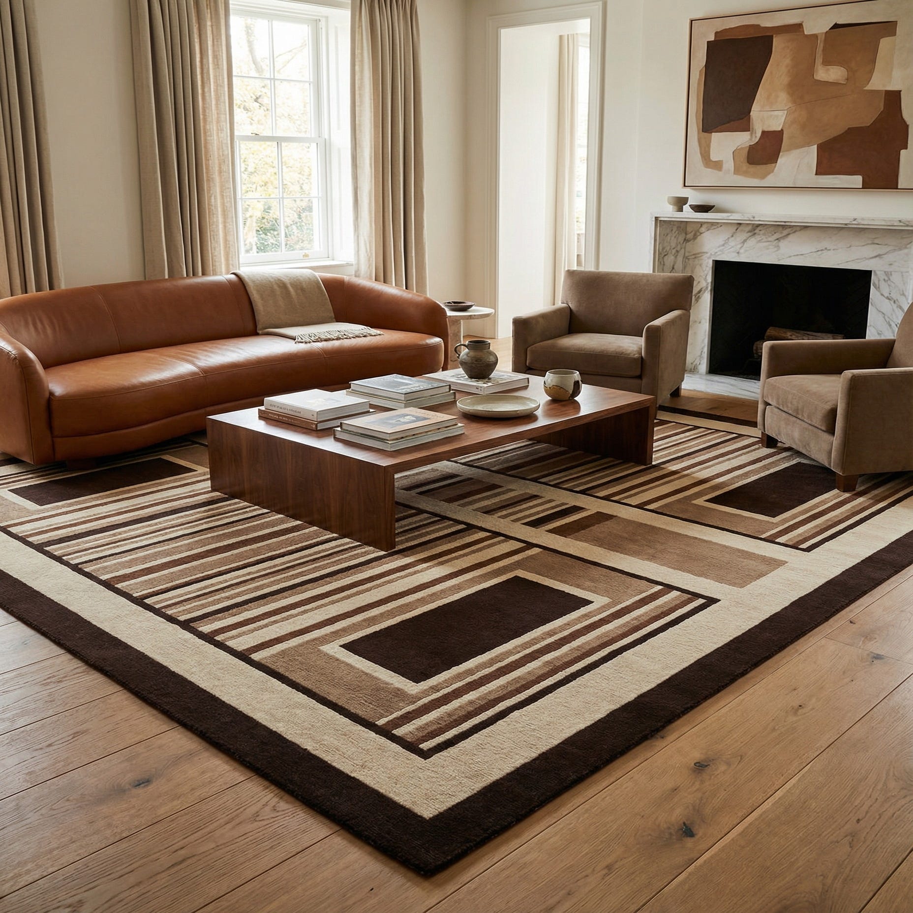 This rug is well-suited for contemporary and modern spaces that praise simple yet impactful design elements. It can serve as the anchor in a living room, under a coffee table, or in a dining area, where its pattern can complement sleek furniture and metallic accents. Alternatively, it can also fit seamlessly into more traditional settings, where its natural wool texture and earthy tones will harmonize with vintage or wood-centric decors.