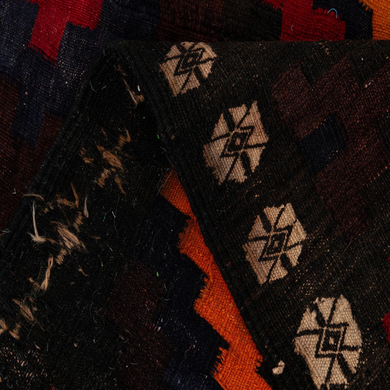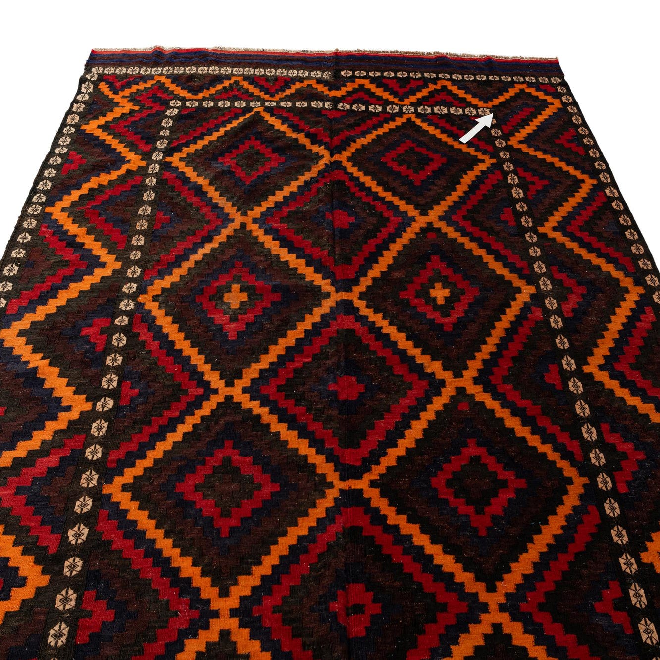 The Kilim Afghan rug, measuring 8x10 feet, is a hand-woven piece crafted from 100% wool, showcasing both durability and craftsmanship. This rug flaunts a rich brown background accented with a bold geometric pattern in hues of burgundy, orange, navy blue, beige, and black. The precise shapes create a sense of rhythm and movement across the rug's surface, while its handcrafted nature ensures that each piece is unique.