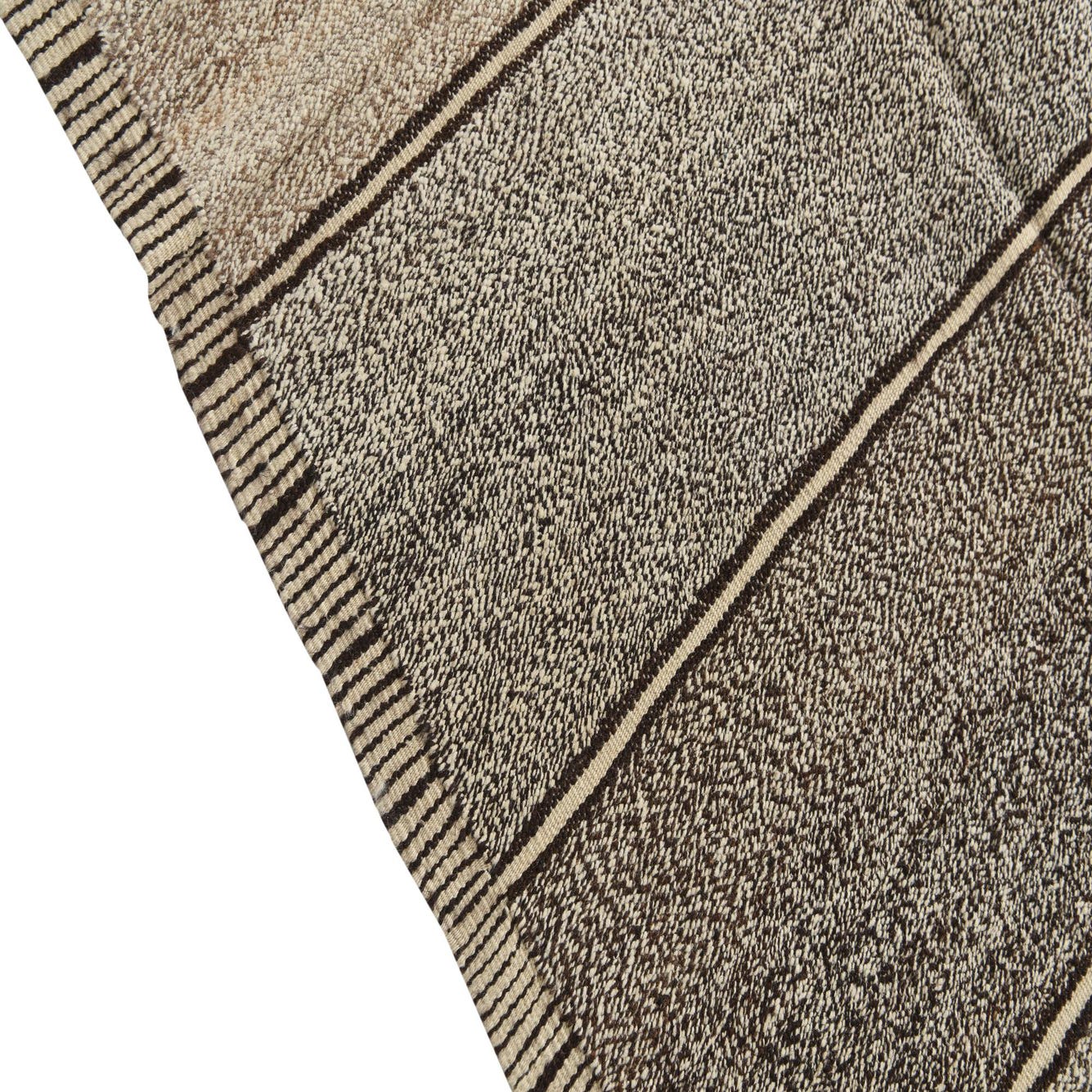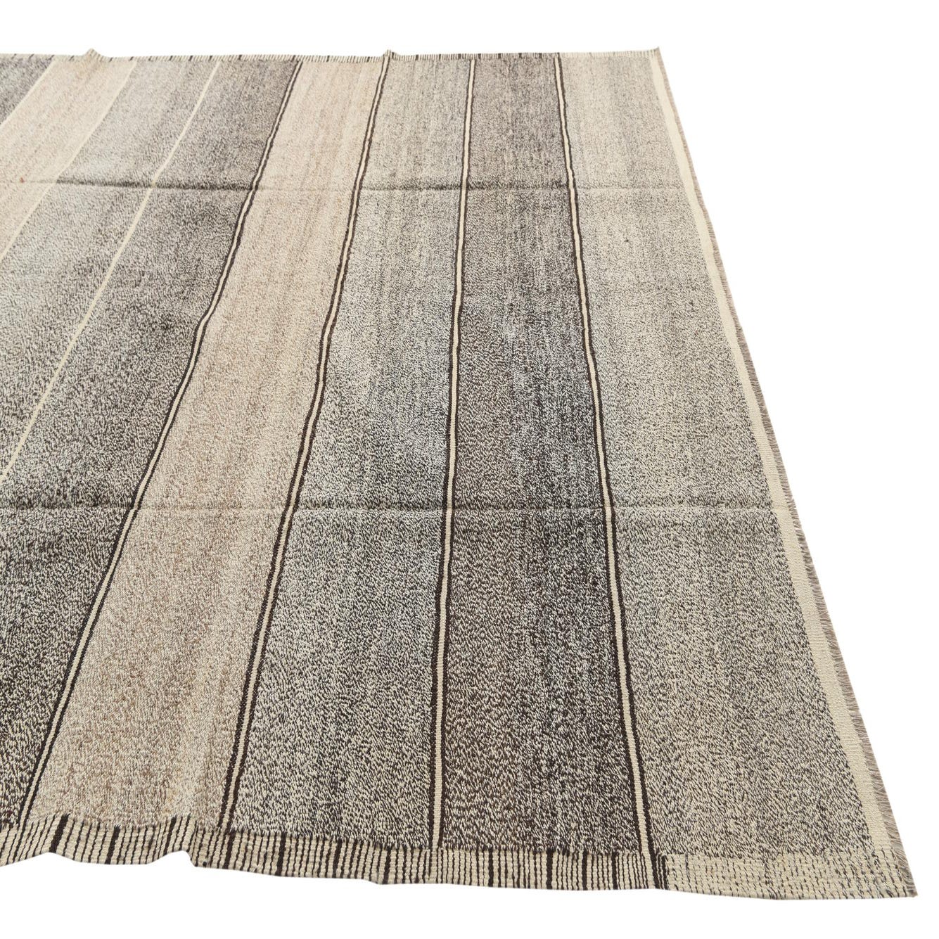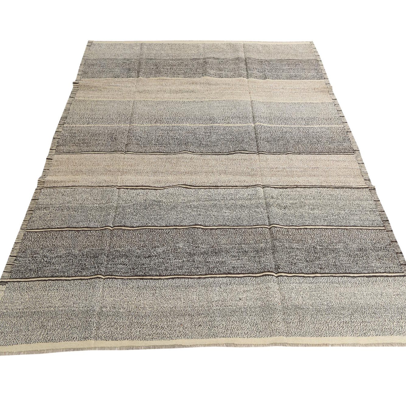 An 8x10 rectangular flatweave wool rug featuring horizontal stripes in varying shades of brown and tan.