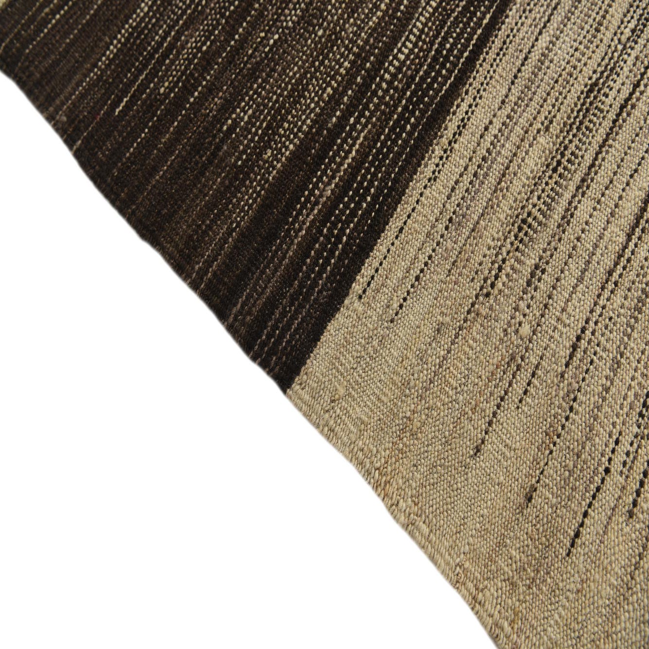 This 8x10 rug from the Kilim Modern collection presents a contemporary take on traditional flat-weave designs. Hand-woven from 100% wool, the rug showcases a geometric pattern with a series of varied-width horizontal stripes in a harmonious blend of brown and beige tones. The background color is a rich, deep brown, which anchors the lighter beige hues, creating an impactful yet balanced visual effect.