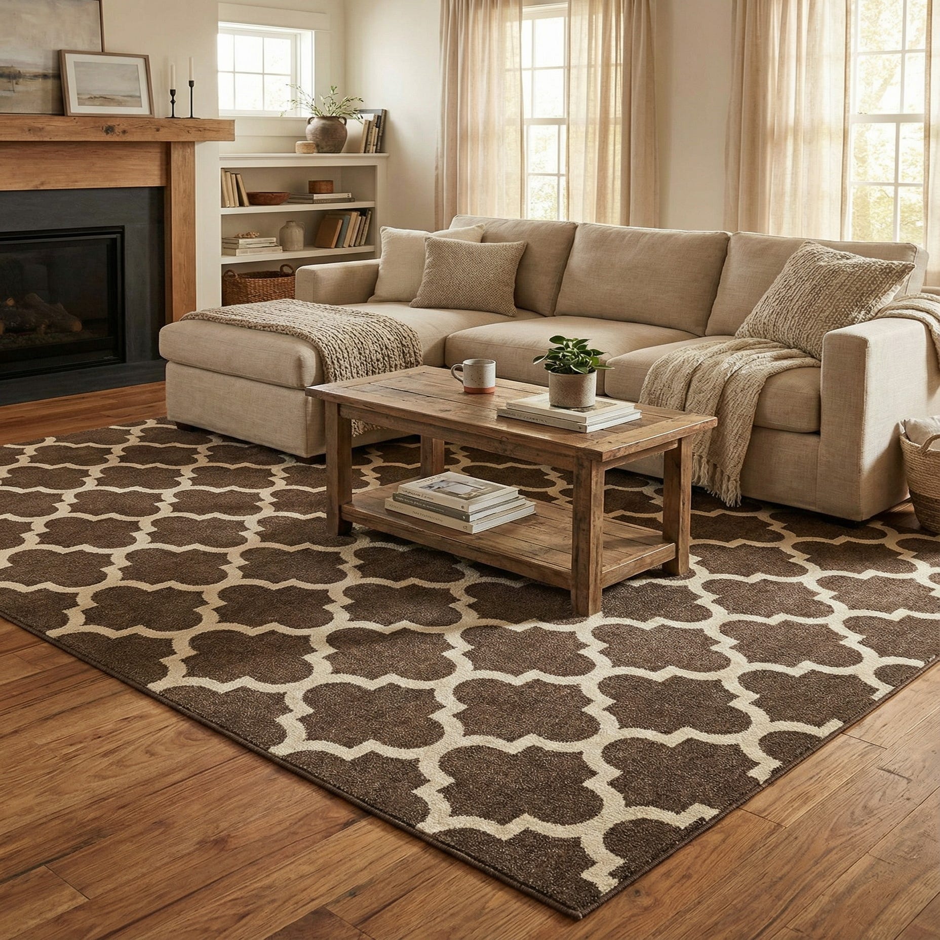 The warm brown and beige palette pairs naturally with wood tones, leather, and neutral upholstery, fitting well in transitional, contemporary, or casual traditional rooms. Place it to anchor a living room seating area, define a dining space beneath a table, or add warmth to a home office or bedroom; it complements solid furnishings and textured accents like linen pillows or a leather accent chair for a balanced, comfortable look.