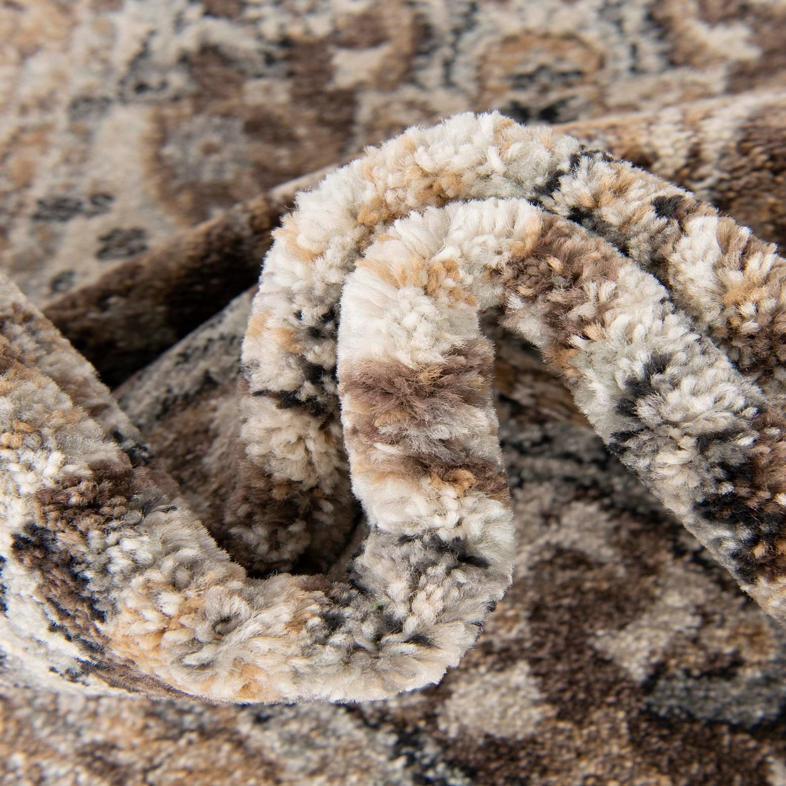 A classic medallion layout unfolds across a warm brown field, where scrolling floral arabesques and layered borders create a balanced, traditional look. Cream, ivory and tan highlights bring light to the central motif while gray tones and black accents add depth and crisp definition. The ornate border echoes the field’s motifs in a slightly smaller scale, giving the piece a finished, lived-in character that pairs well with both antique and updated furnishings.