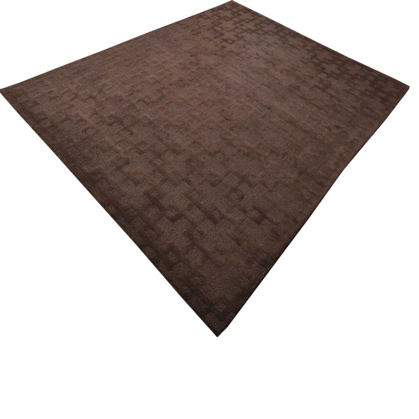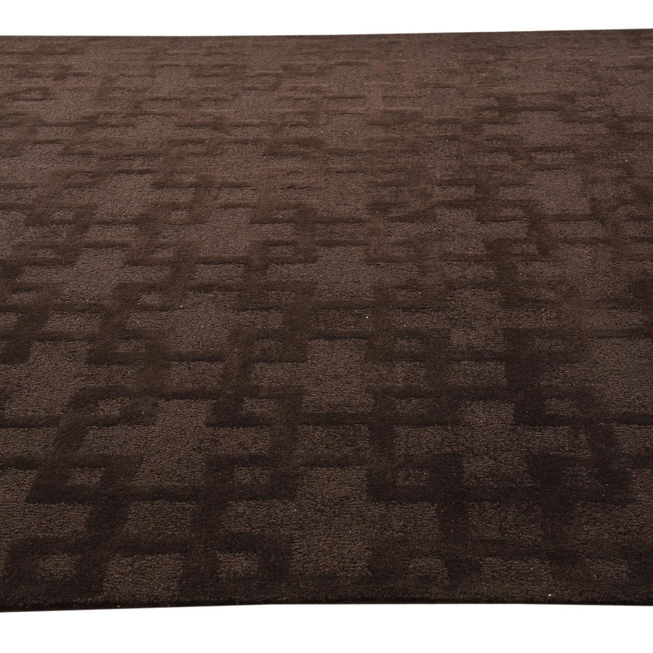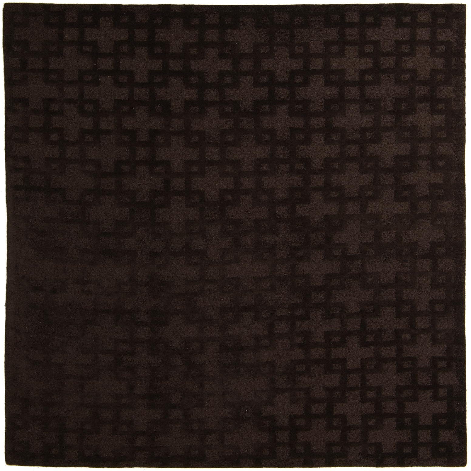 The Luna collection presents a distinguished 8x10 hand-tufted rug crafted from a blend of wool and cotton, offering both durability and comfort underfoot. This particular rug features a compelling geometric pattern that consists of intersecting lines creating a series of squares and rectangles across the surface. The pattern is rendered in a subtle contrast of brown hues, with a deep brown background color that adds to the rug's visual depth and texture.