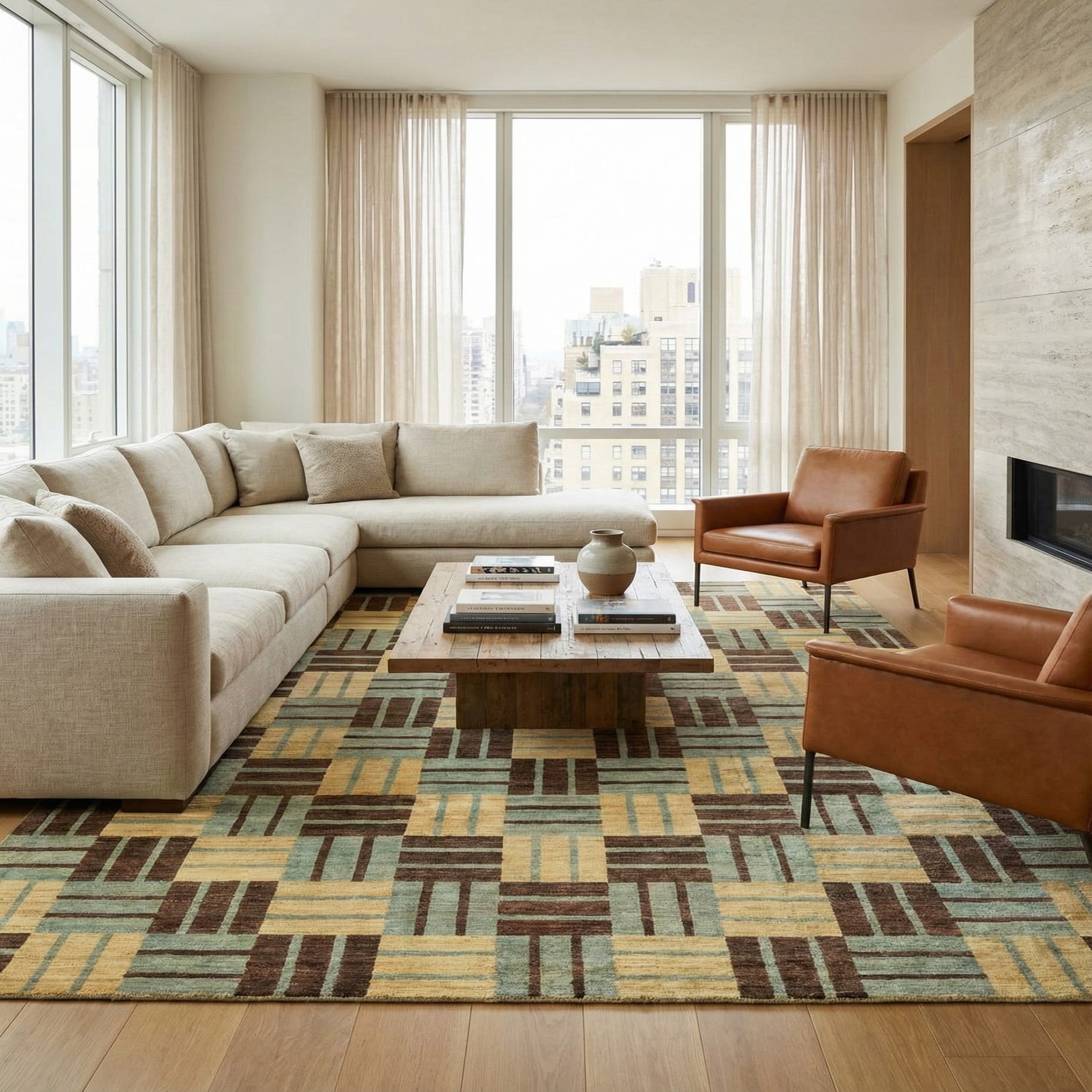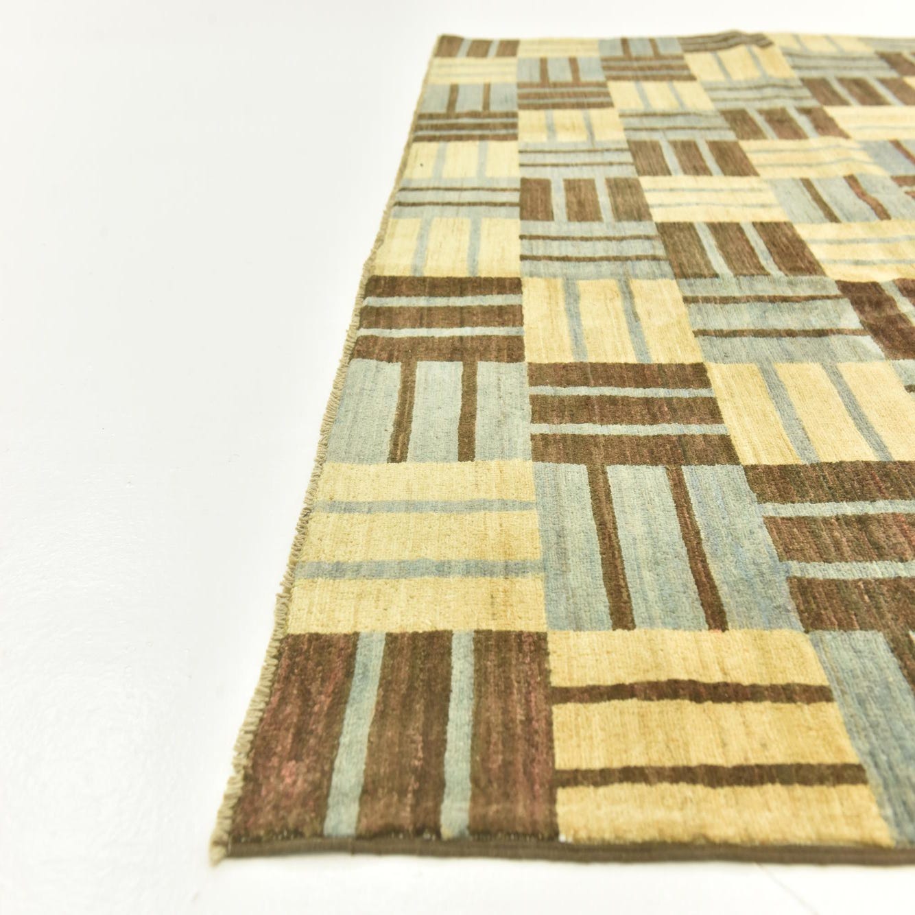 A rectangular 8x10 Modern Ziegler rug featuring an abstract geometric pattern of brown, tan, and light blue blocks.
