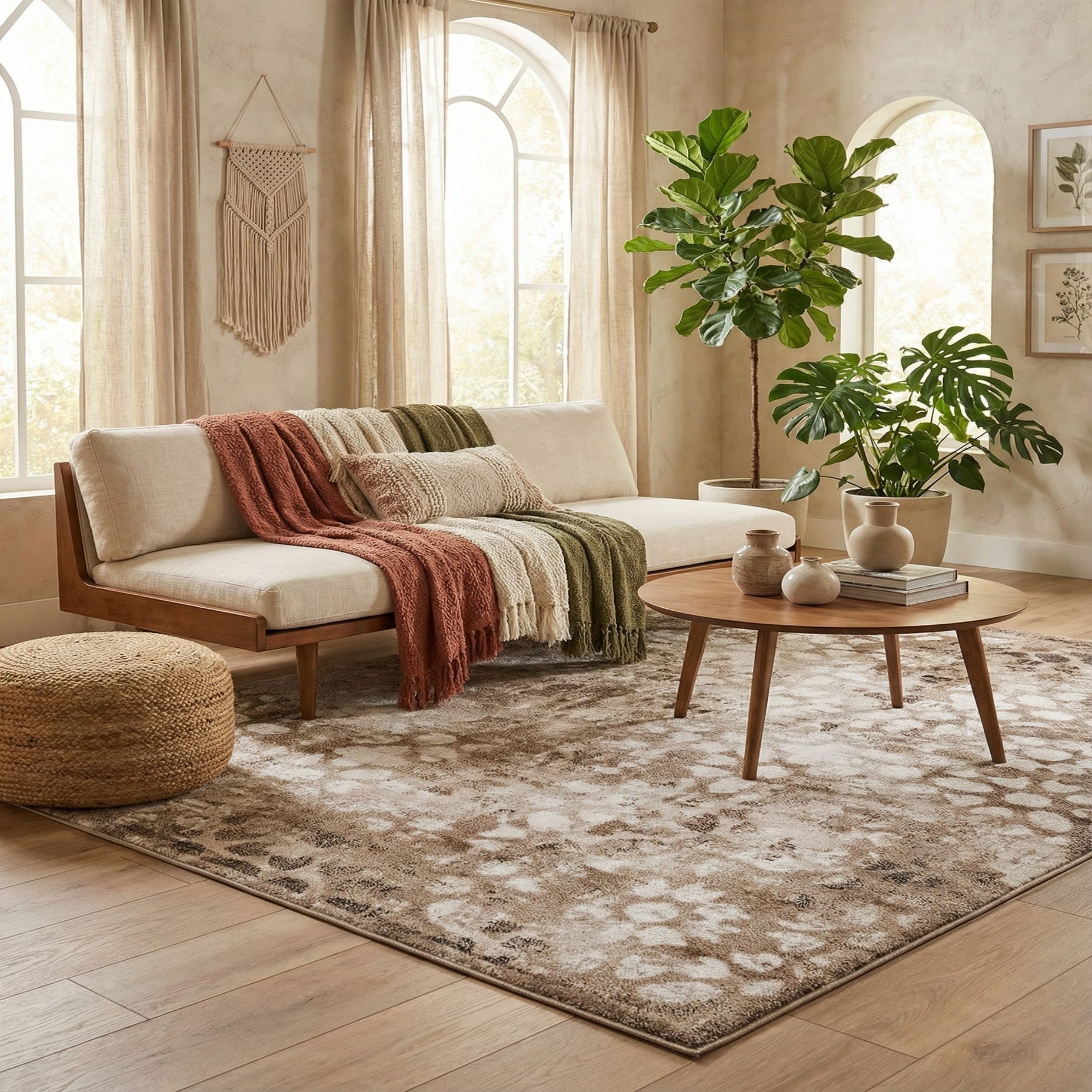 This rug works well as an anchor beneath a seating group in a living room, layered over hardwood to soften a bedroom, or placed in a home office to add visual interest without dominating the space. It pairs naturally with tan leathers, warm woods like oak or walnut, neutral linen upholstery, and mixed-metal accents, making it a good fit for contemporary, transitional, or modern-traditional interiors that favor a calm, textured palette.