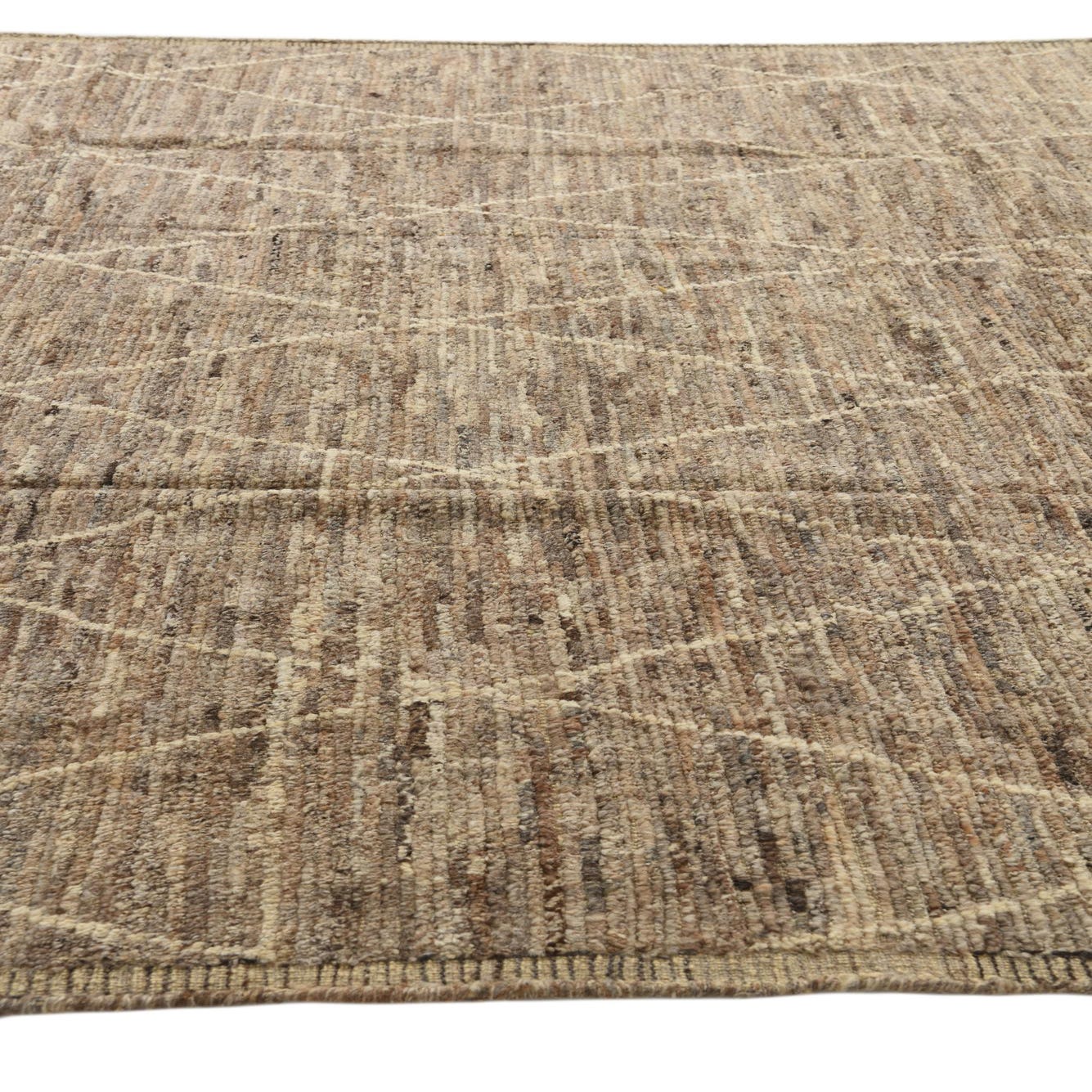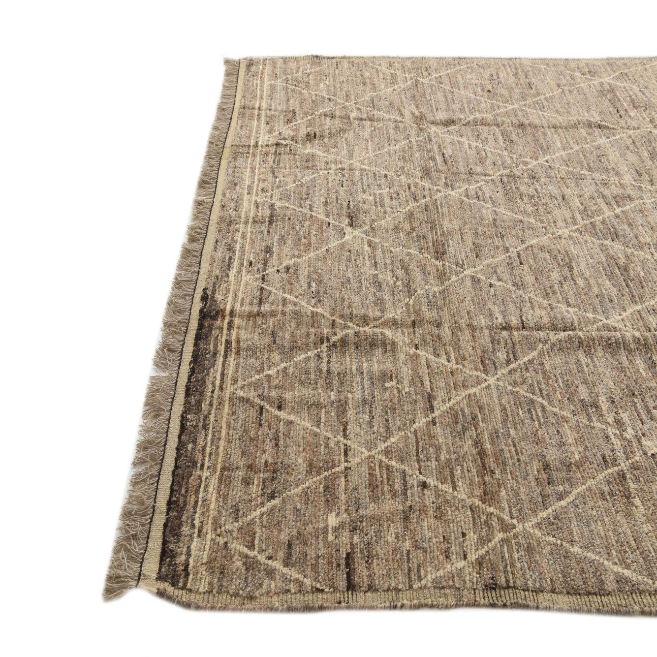 This Moroccan collection rug features a rich brown background that provides a deep canvas for the contrasting cream and light brown geometric diamond pattern that adorns its surface. Hand-knotted from 100% wool, the rug offers a texture that is pleasing to touch and underfoot, with a quality that ensures durability and longevity. The inclusion of fringe on each end adds a traditional touch, enhancing the artisanal appeal of the piece.