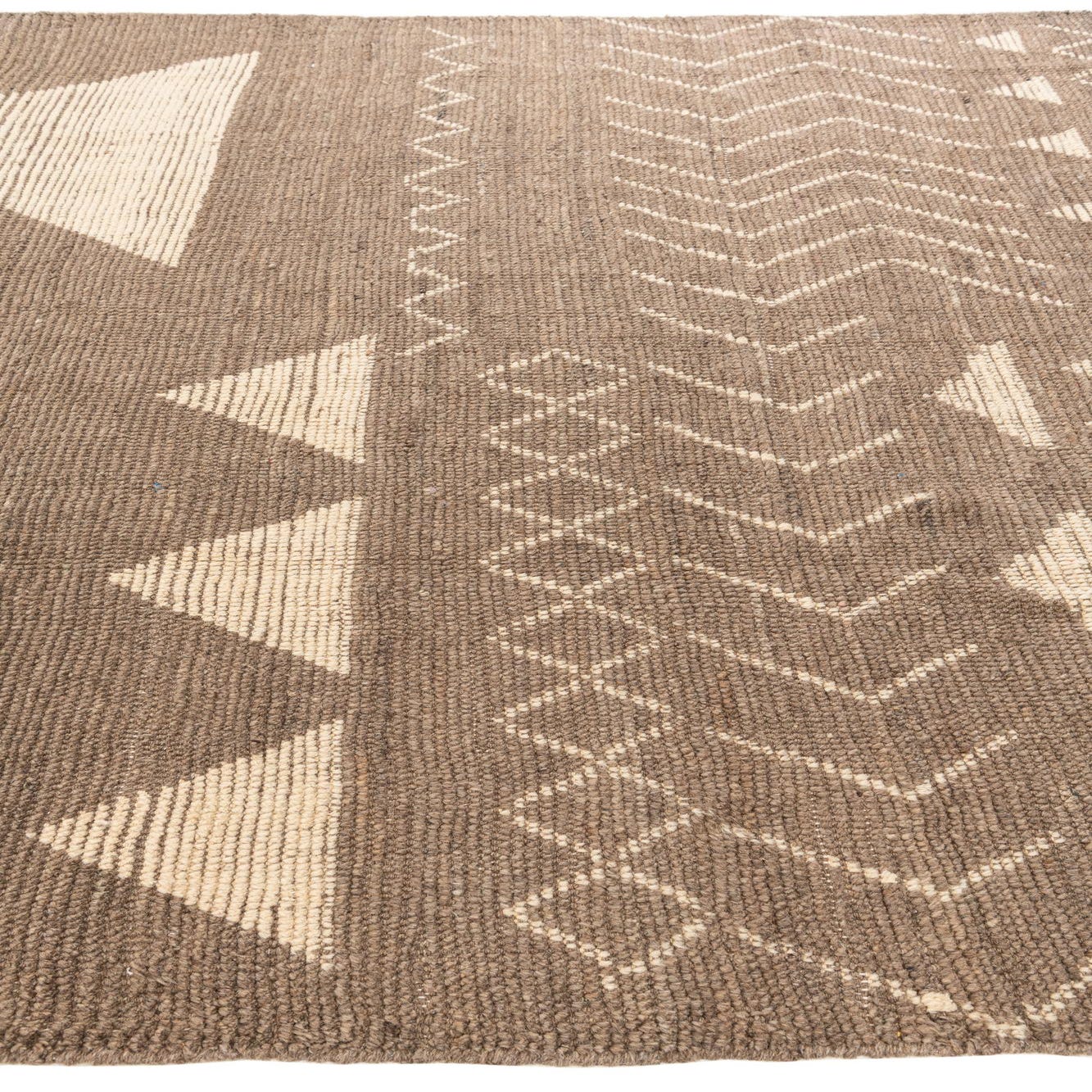 A brown 8x10 rectangular wool shag rug with a modern tribal pattern featuring cream-colored geometric shapes and zigzags.
