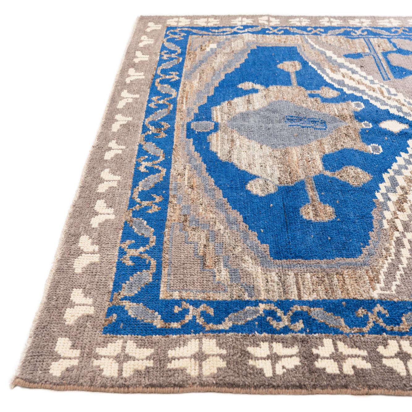 Primary color is Brown. Colors in this rug include: Brown, Blue, Ivory, Navy Blue.