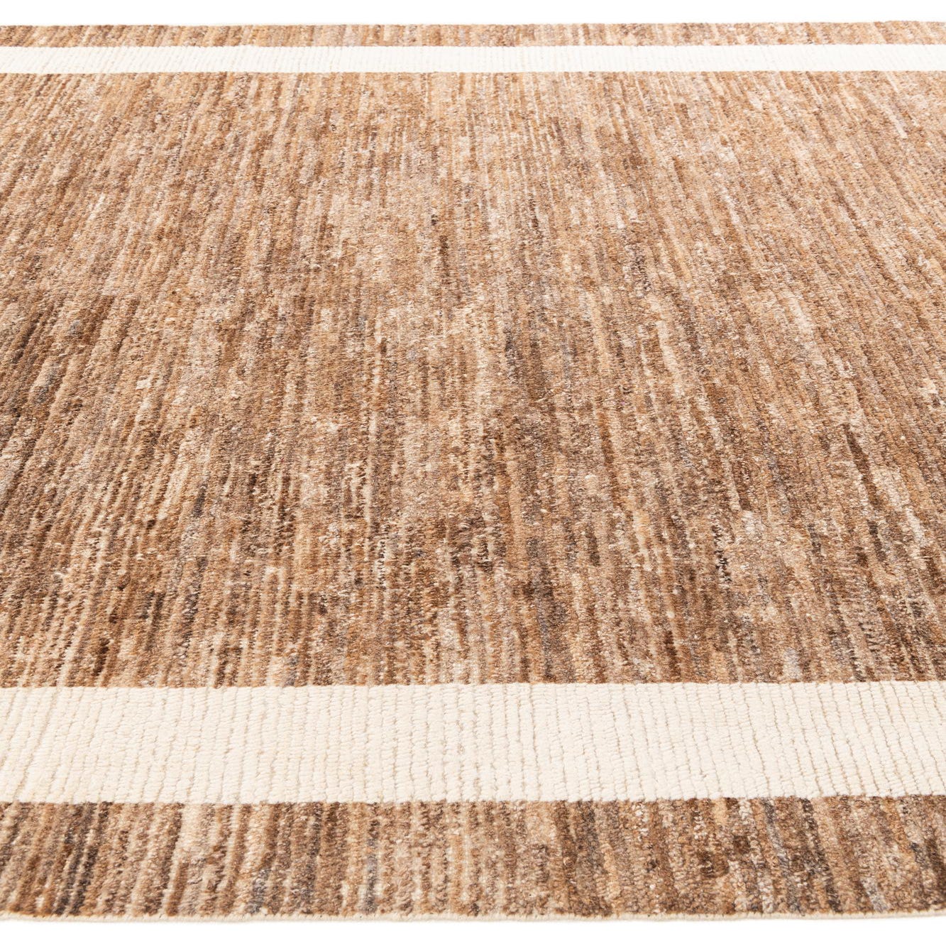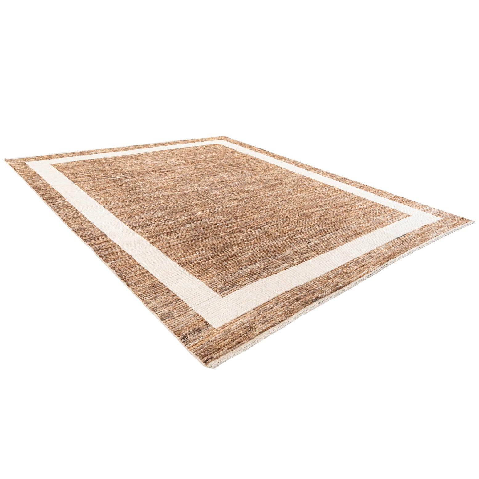 A rectangular 8x10 brown shag rug with a thick off-white border, perfect for a modern living room.