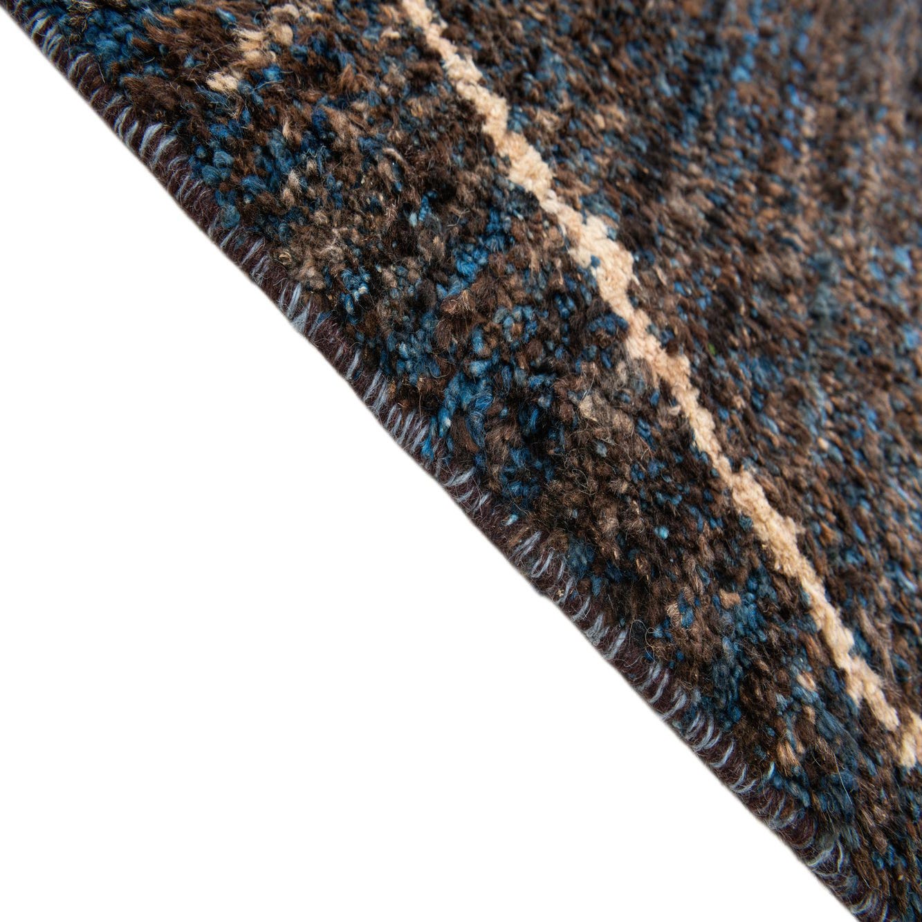 Primary color is Brown. Colors in this rug include: Brown, Blue, Cream.