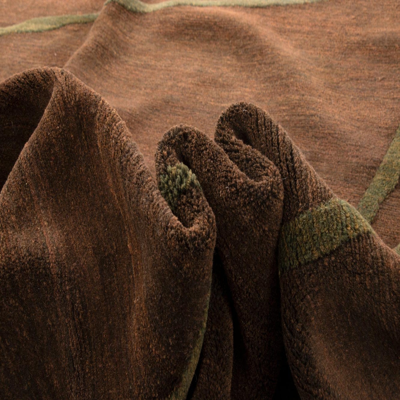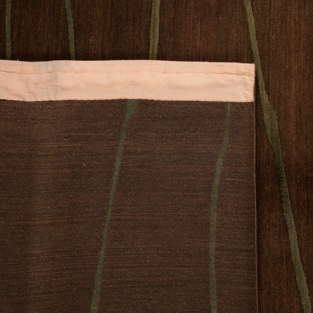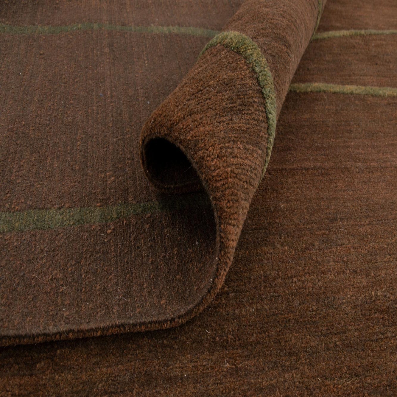 A rectangular 8x10 Odegard wool rug with a rich brown field and an abstract, organic green line pattern.