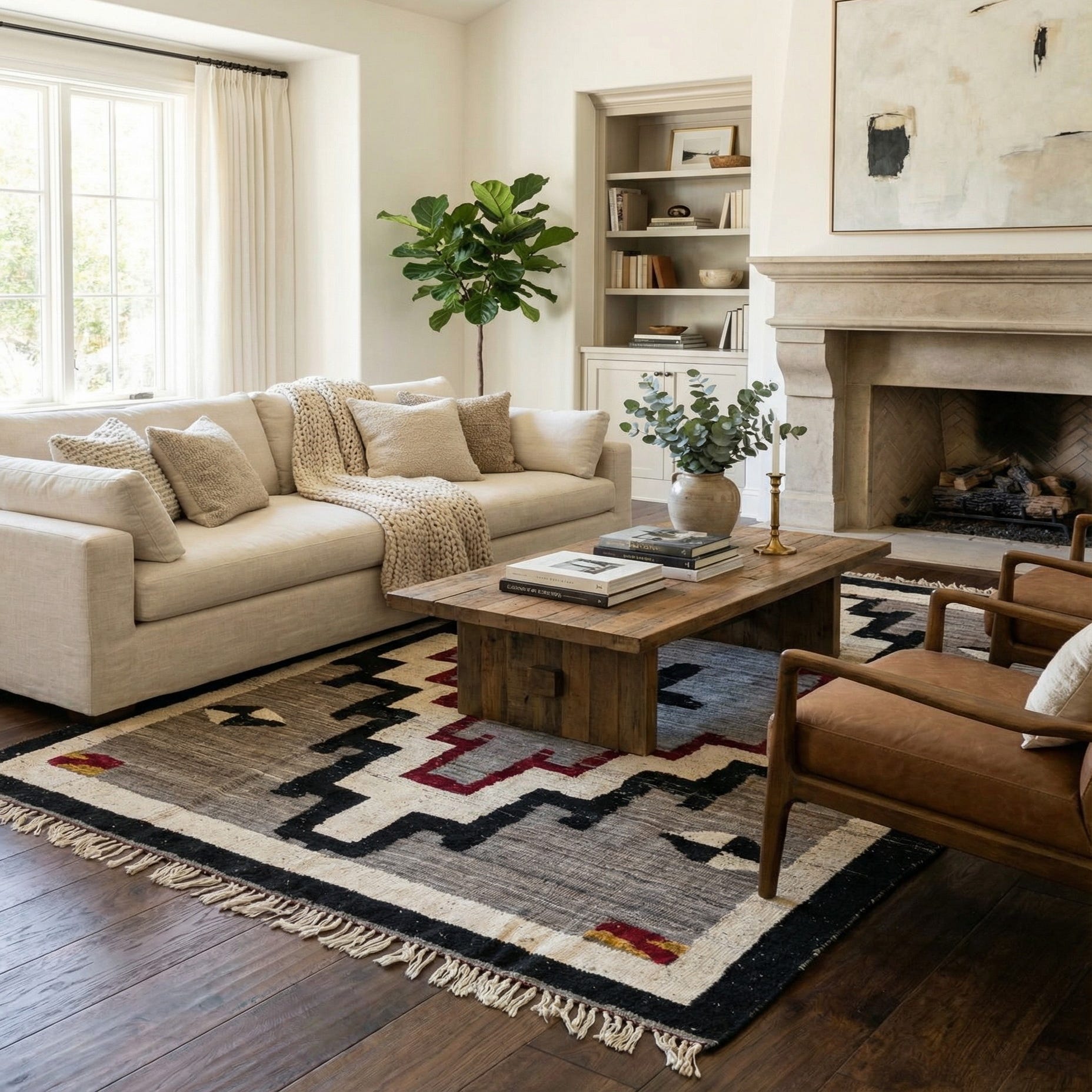 The earthy hues and timeless design of this 8x10 rug make it adaptable to a variety of interior styles, particularly well-suited to spaces that embrace a rustic, traditional, or eclectic aesthetic. It would serve as an anchor in living rooms, offices, or dining areas where it can complement solid wood furniture and add warmth to neutral color schemes. Its robust wool make-up caters to areas with medium foot traffic, ensuring that the rug not only elevates the ambiance but also maintains its appearance over time.