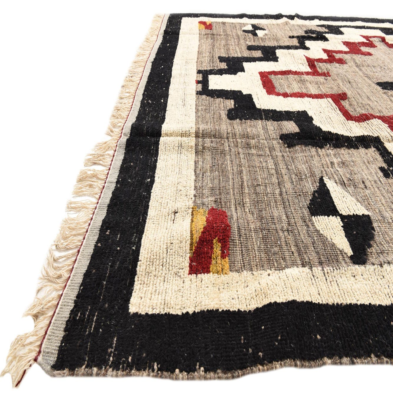 A rectangular 8x10 brown, tan, black, and red modern abstract wool rug with a geometric pattern and fringe.