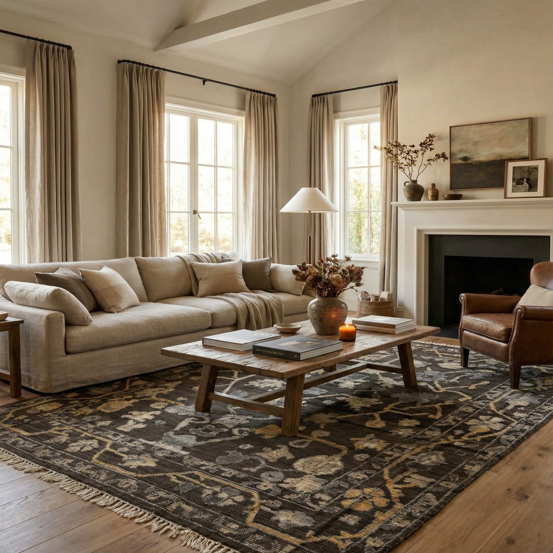 Place this rug under a sofa and coffee table to ground a living area, layer it over wood floors to introduce texture in a bedroom, or center it beneath a dining table to anchor a dining space. It pairs especially well with leather seating, warm wood tones, neutral upholstery, and metal or brass accents—equally at home in transitional, farmhouse, or classic interiors where an understated, patterned foundation is desired.