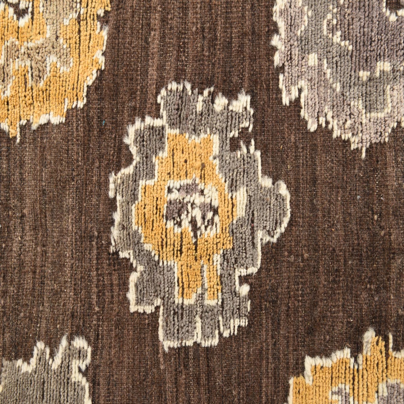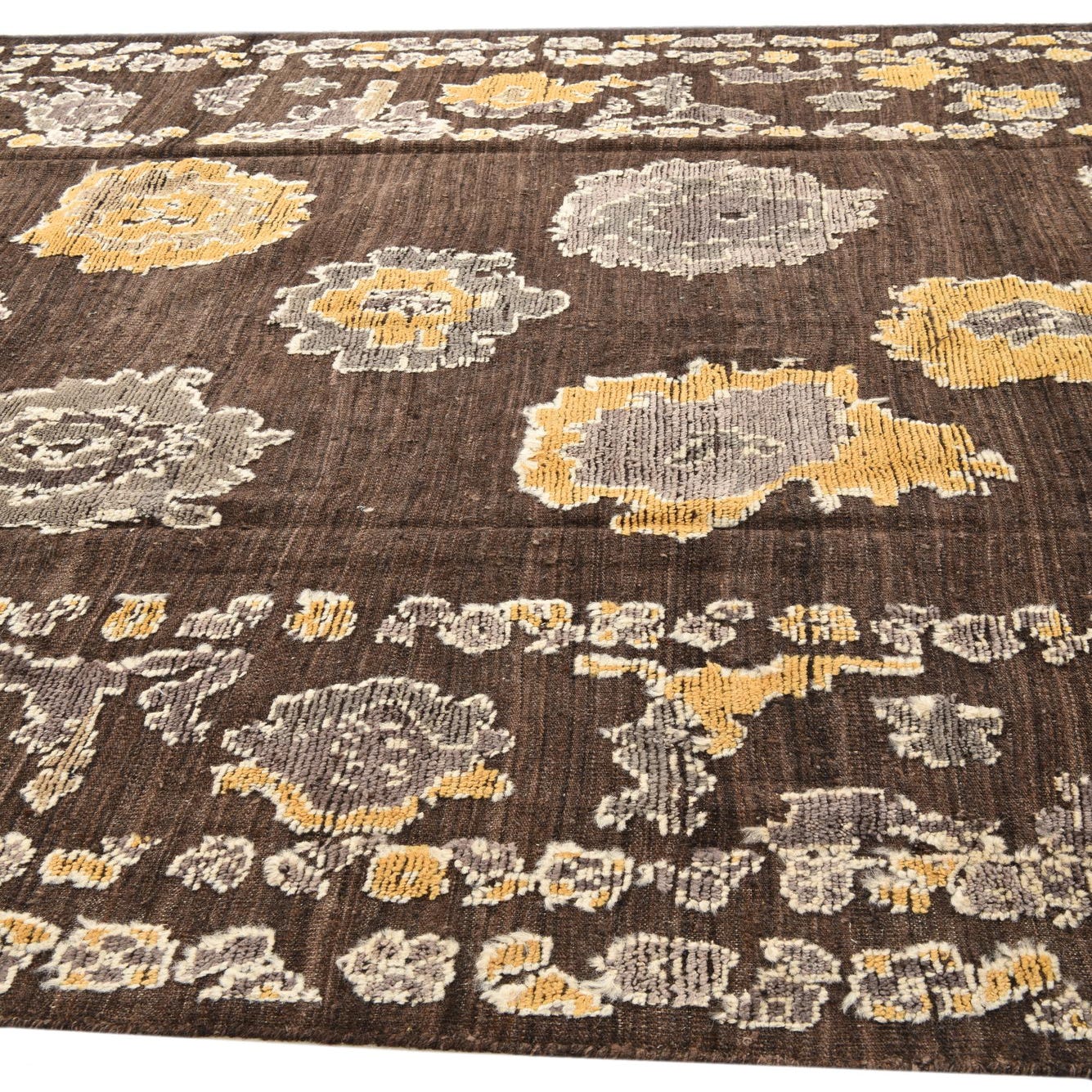 Primary color is Brown. Colors in this rug include: Brown, Ivory, Yellow, Gray.