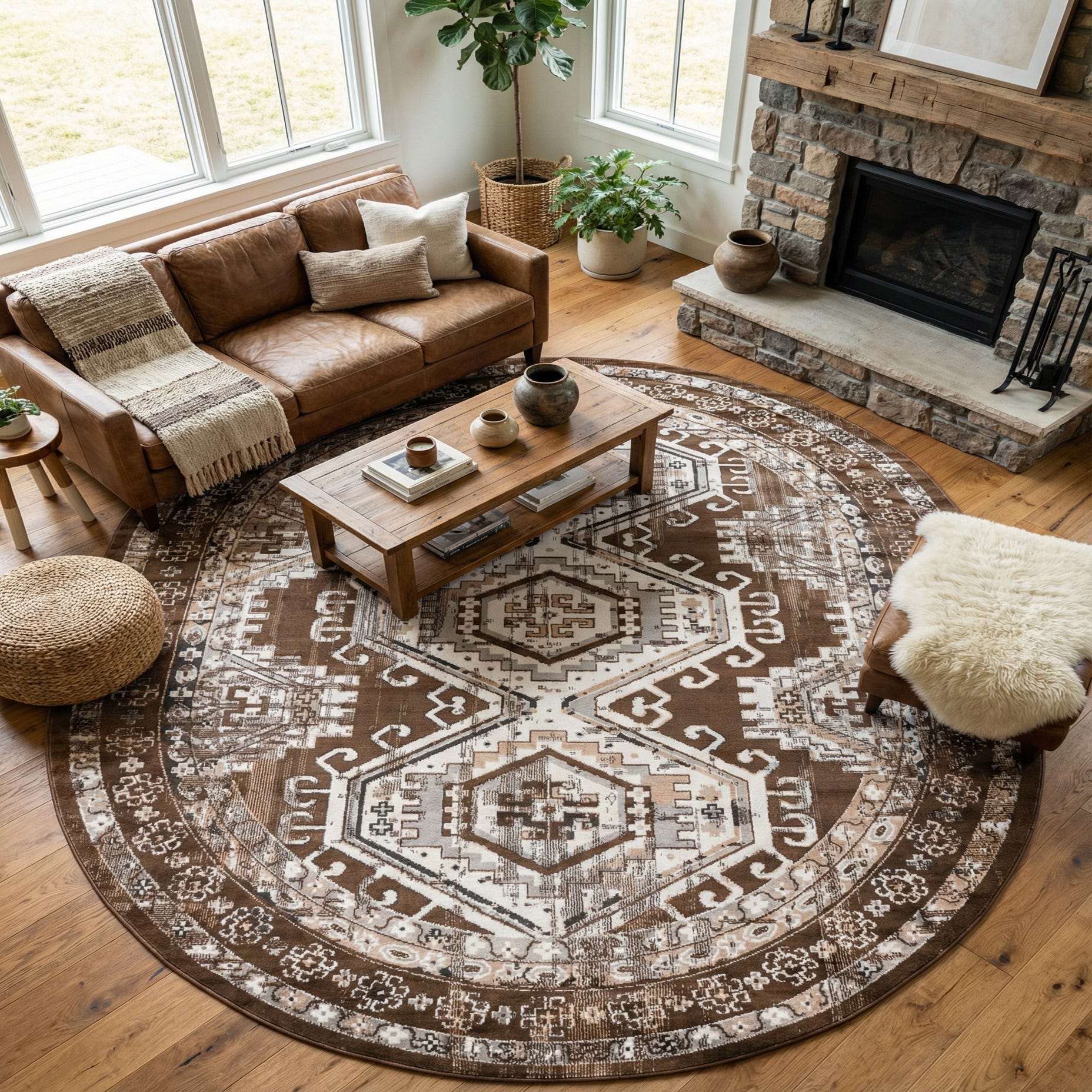A warm brown ground anchors a classic medallion layout with geometric motifs and layered borders. Ivory, beige, and soft gray highlights trace the hexagonal center medallions and decorative bands, creating a gently distressed look that adds visual texture without heavy contrast. The surface has a low, dense pile that feels smooth underfoot, with the polypropylene construction giving the rug a soft, slightly velvety hand while maintaining clear pattern definition.