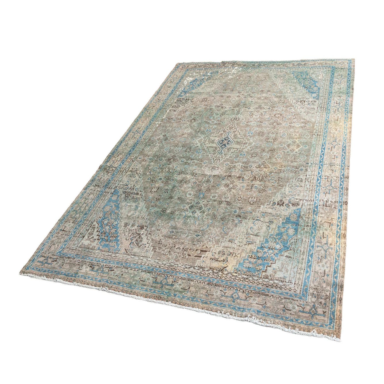 An 8x10 rectangular vintage wool rug with a distressed brown and tan field, featuring a faded blue medallion and border.