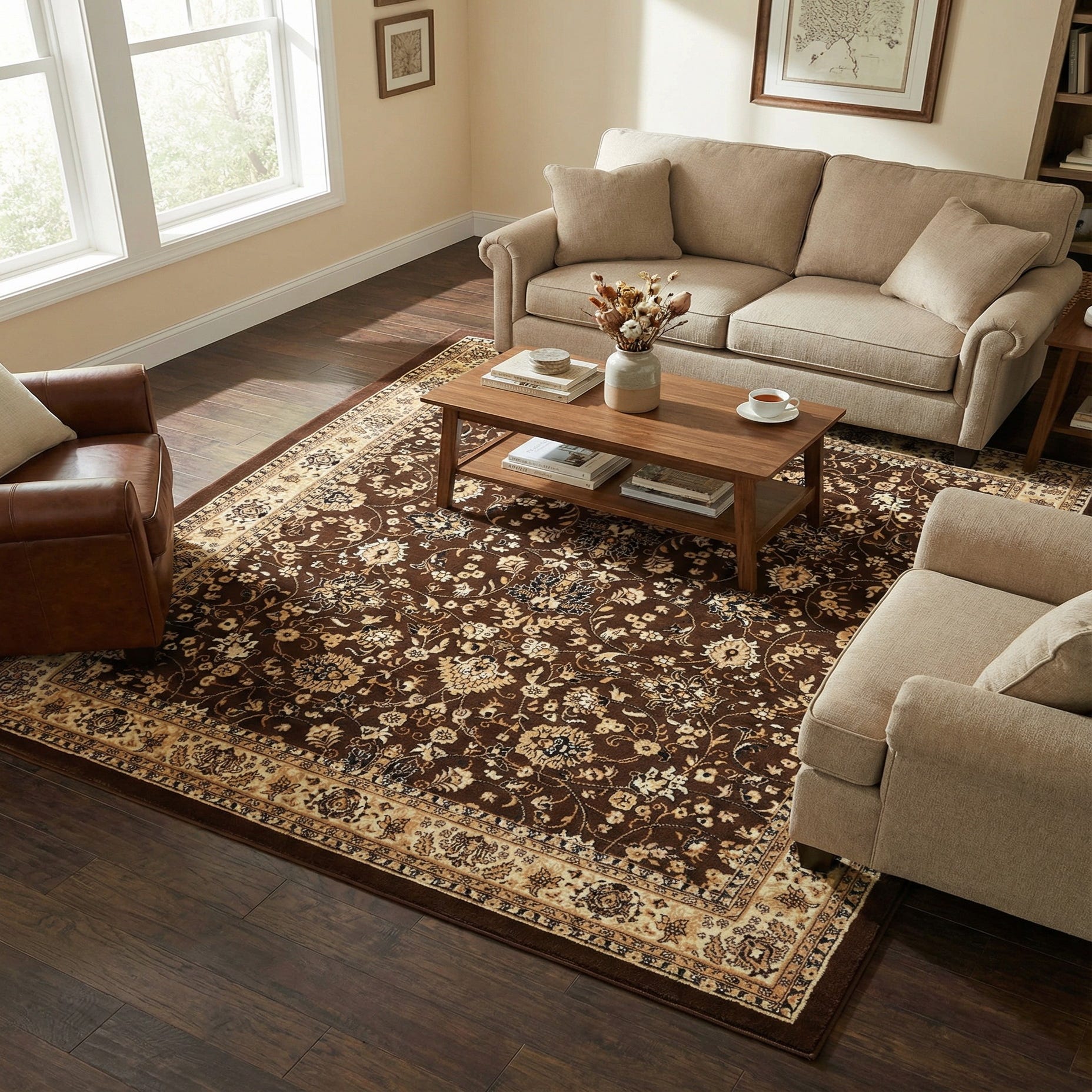A rich brown field sets the stage for a densely patterned, traditional floral and vine design rendered in cream, tan and accents of black. The layout centers on a balanced medallion-like arrangement with scrolling vines and clustered blossoms that repeat across the surface, while a cream border edged in tan and black frames the composition and adds contrast. Machine made of 100% polypropylene, the rug has a low, even pile with a smooth, slightly dense hand that feels soft underfoot and holds the pattern crisply.