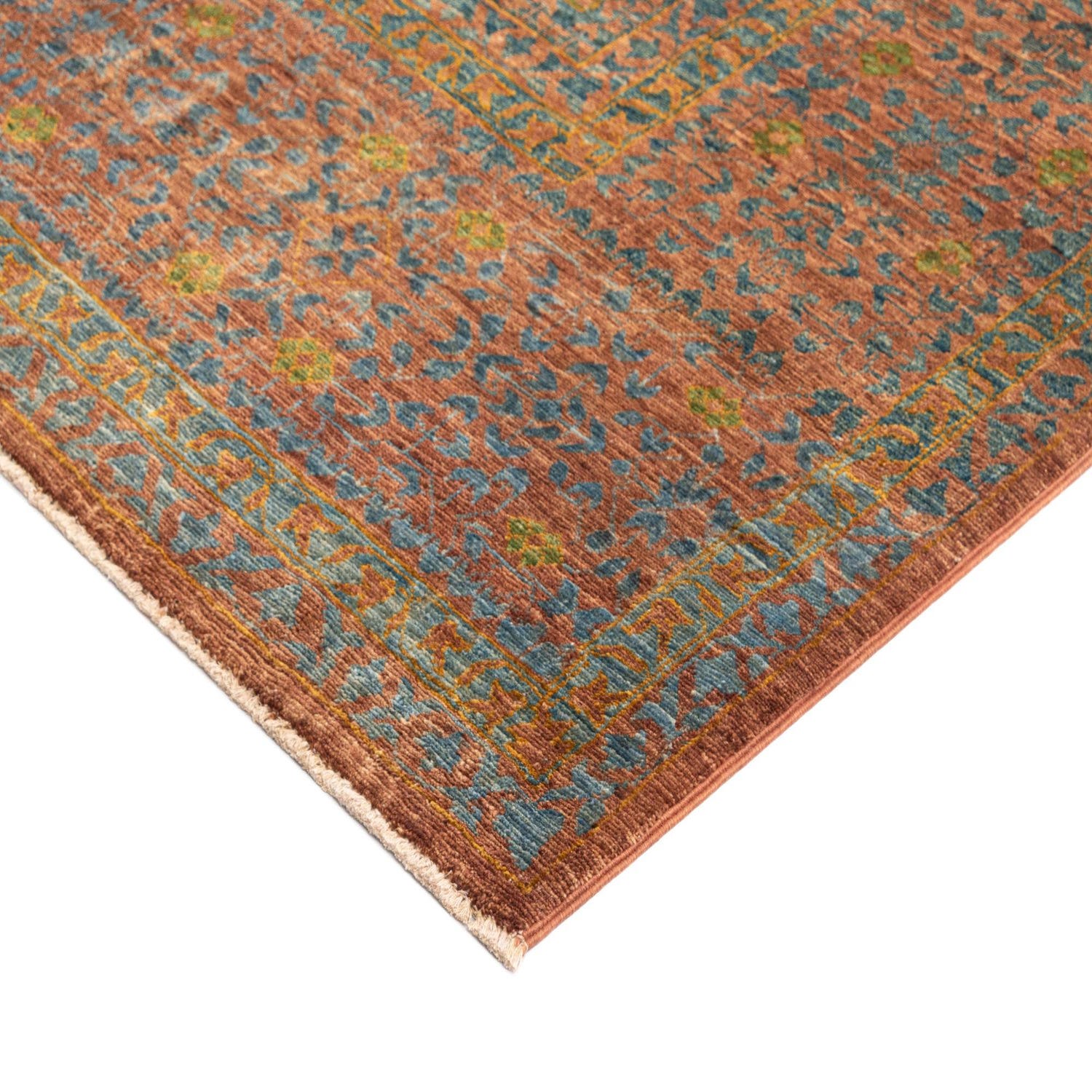 This rug is versatile in its application, seamlessly integrating with classic decor and serving as a statement piece in more modern settings. It would also anchor furniture beautifully in a living room, bring warmth to a dining area, or add character to a spacious bedroom. The earthy tones and classic patterns are well-suited to spaces featuring natural materials such as wood or stone, as well as rooms with a palette seeking a touch of traditional elegance.
