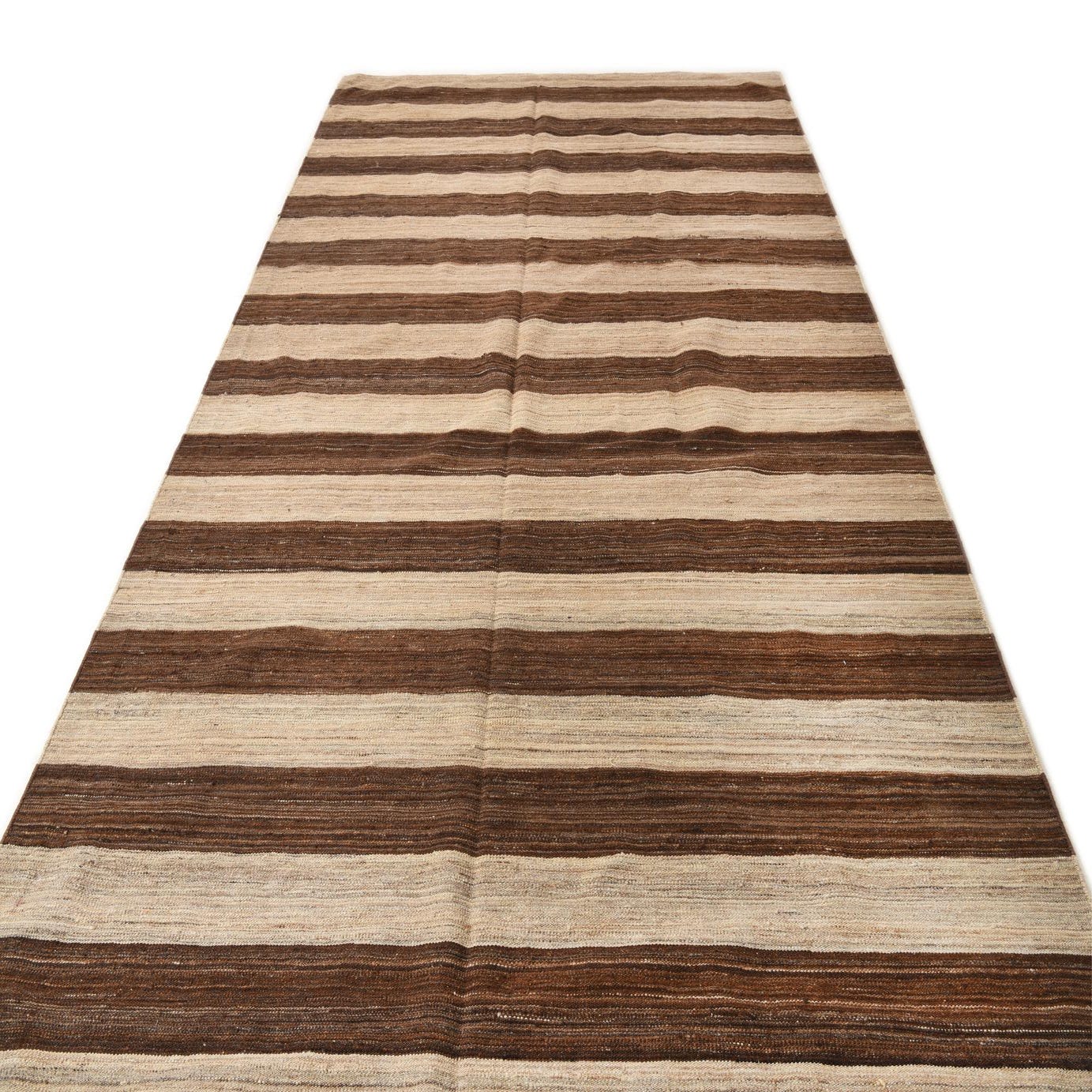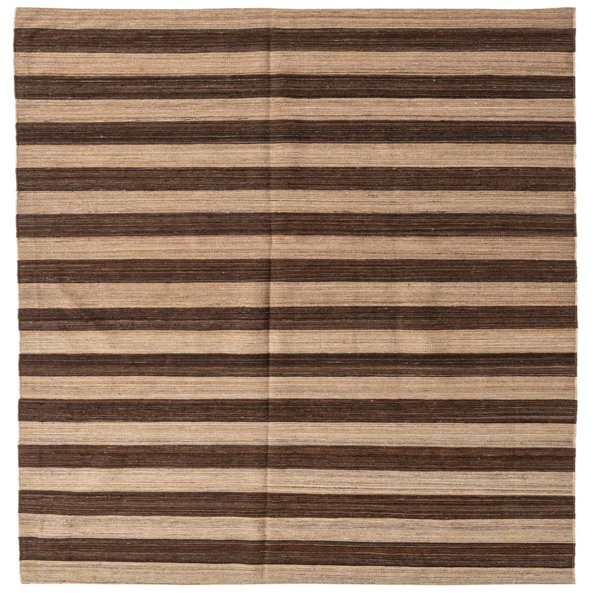 A large 8x11 rectangular Kilim Modern rug with alternating horizontal stripes of dark brown and light tan, made from 100% wool.