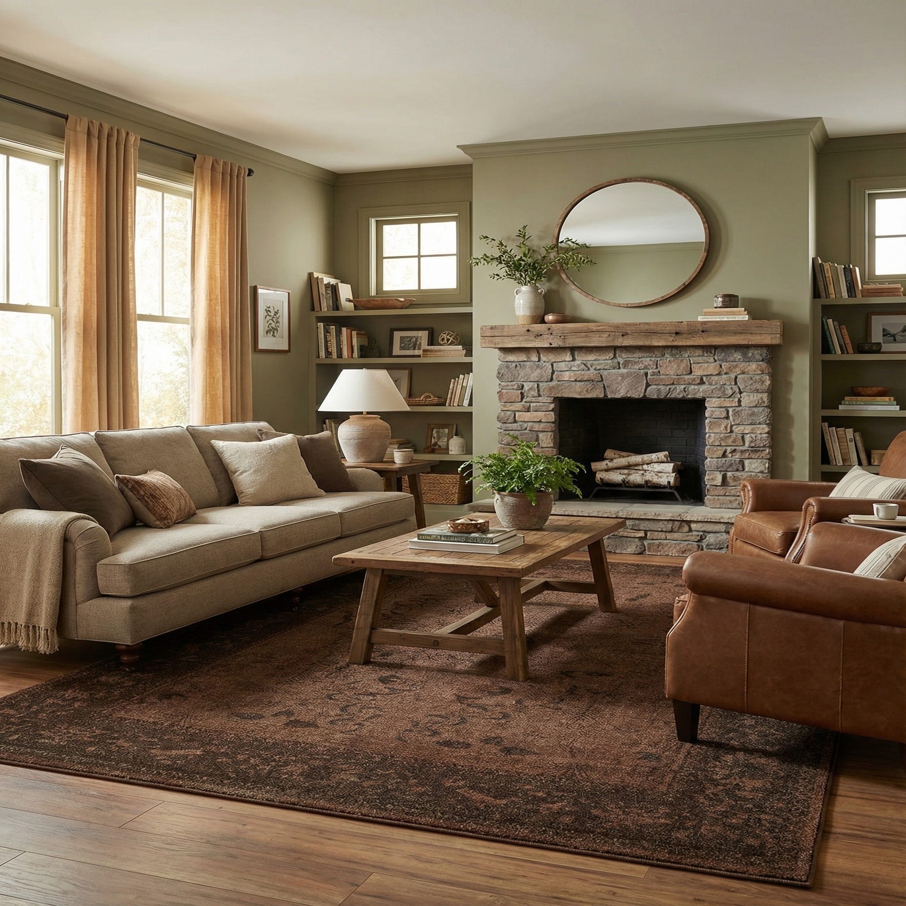 A traditional medallion and scrolling-vine pattern is set into a rich brown field with soft beige highlights that trace the floral motifs and inner borders. The design has a gently worn, vintage-inspired look that allows the pattern to sit quietly in the room rather than dominate it. The outer border carries a slightly darker brown, framing the center and adding depth while the subtle beige detailing brings a touch of contrast and visual warmth.