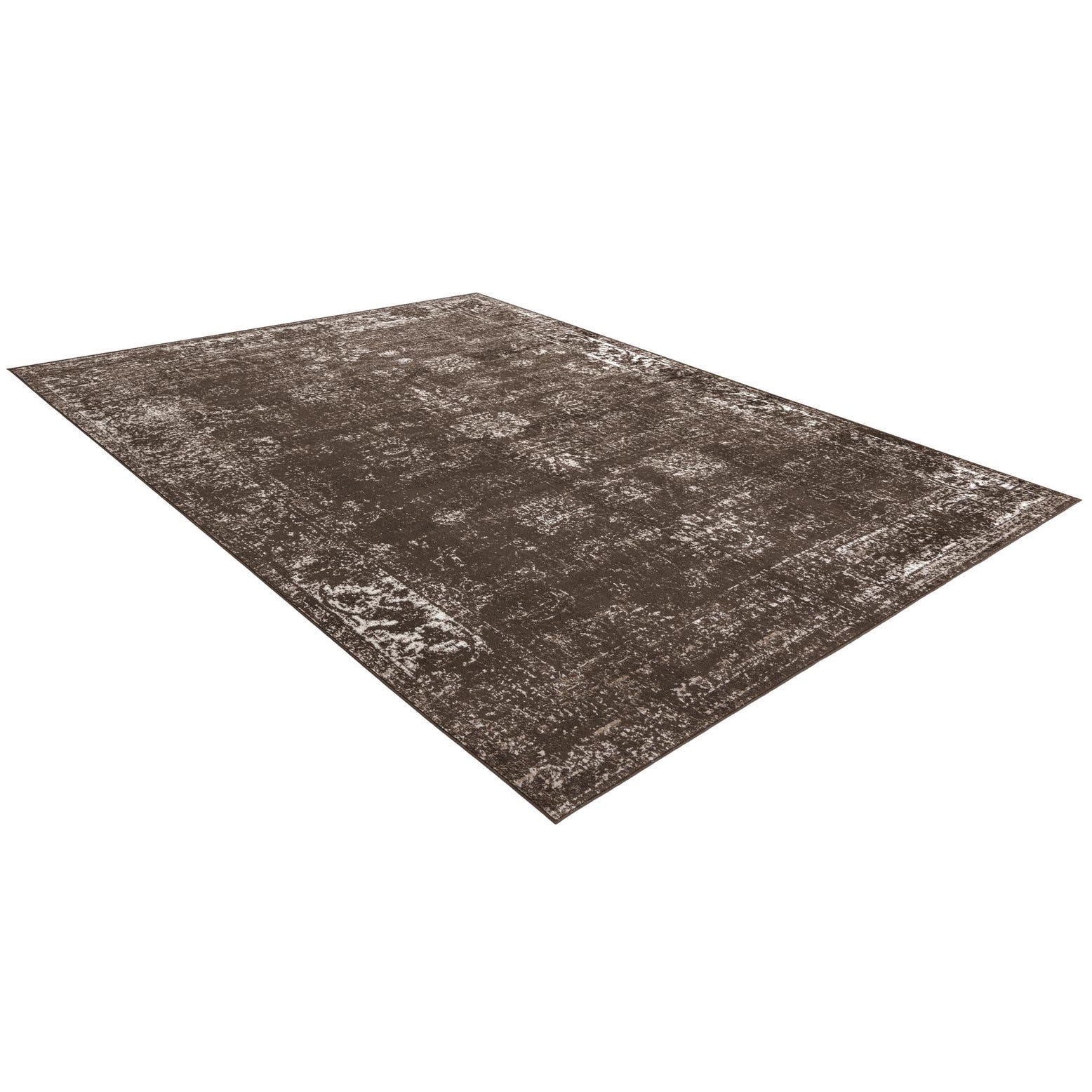 This low?pile, machine?made rug is crafted from 100% polypropylene and presents a lived?in, vintage?inspired pattern on a warm brown background. Ivory and tan highlights break up the field with distressed medallion and border motifs that read softly rather than boldly, giving the rug an aged character without heavy contrast. The surface feels smooth and tightly woven underhand, with a low profile that skims the floor and offers a subtle, slightly satiny sheen typical of polypropylene fibers.