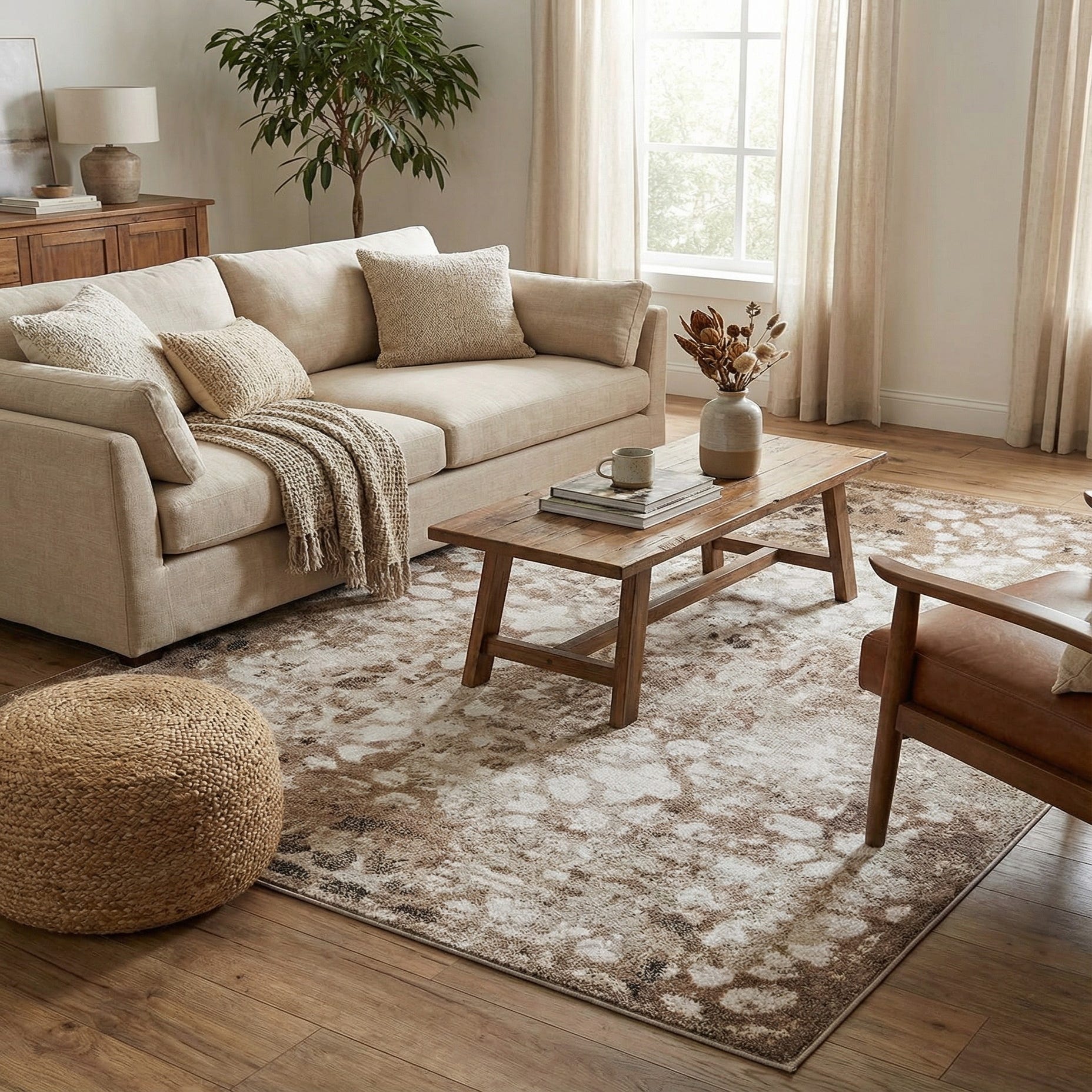 Use this rug to anchor a living room seating area or place it beneath a bed to add subtle pattern without overwhelming neutral furnishings. It pairs well with warm wood tones, leather sofas, and textured linens for a transitional or modern-traditional aesthetic, and it also brings warmth to minimalist spaces that need visual depth.