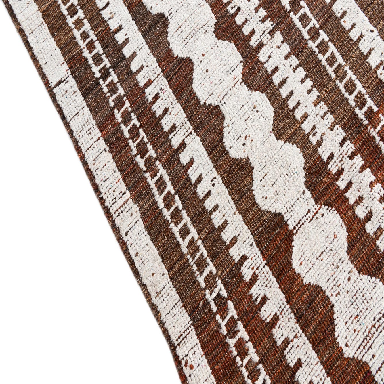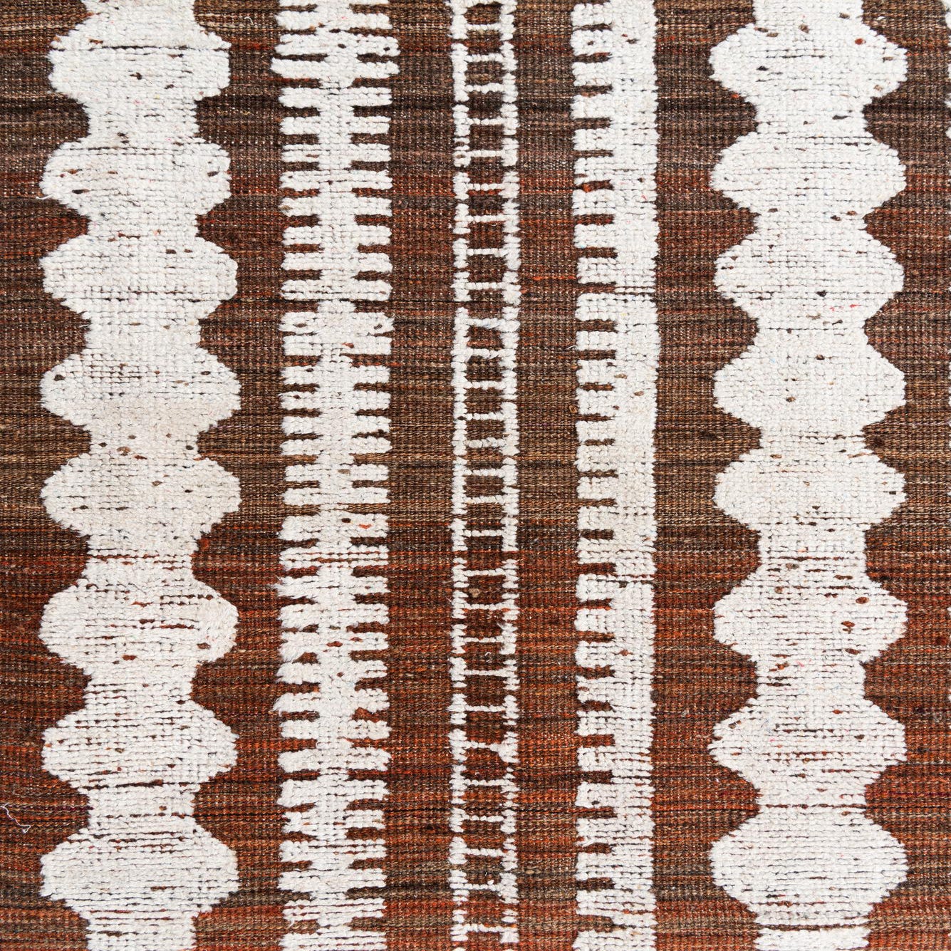 This Moroccan collection rug is a hand-knotted piece, meticulously crafted from 100% wool to offer both durability and comfort underfoot. Measuring 8x11, it features a linear pattern composed of alternating brown and ivory bands, creating a harmonious contrast that echoes the beauty of traditional Moroccan design. The rug's texture is rich and inviting, reflecting the high-quality wool and the expertise of its artisan creators.