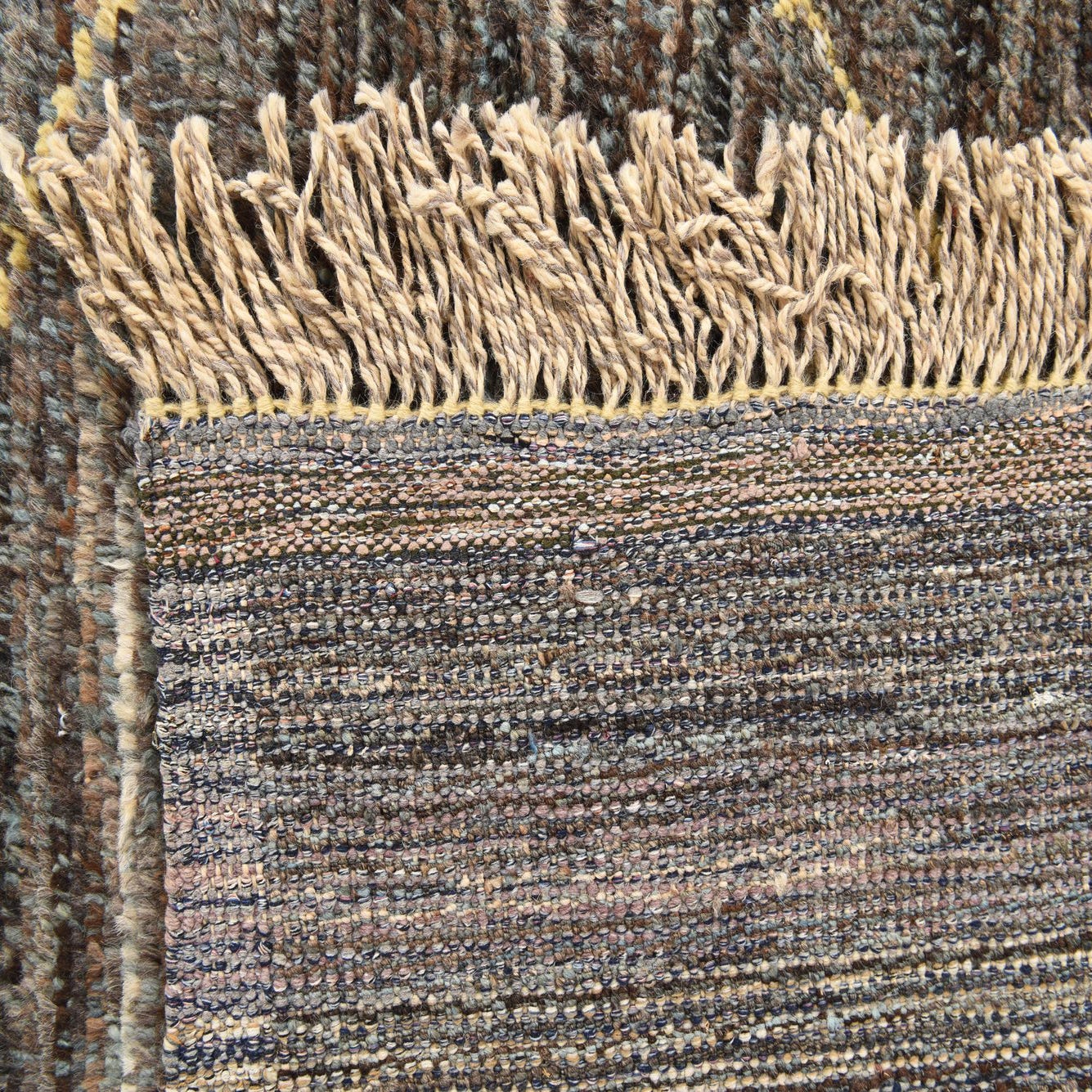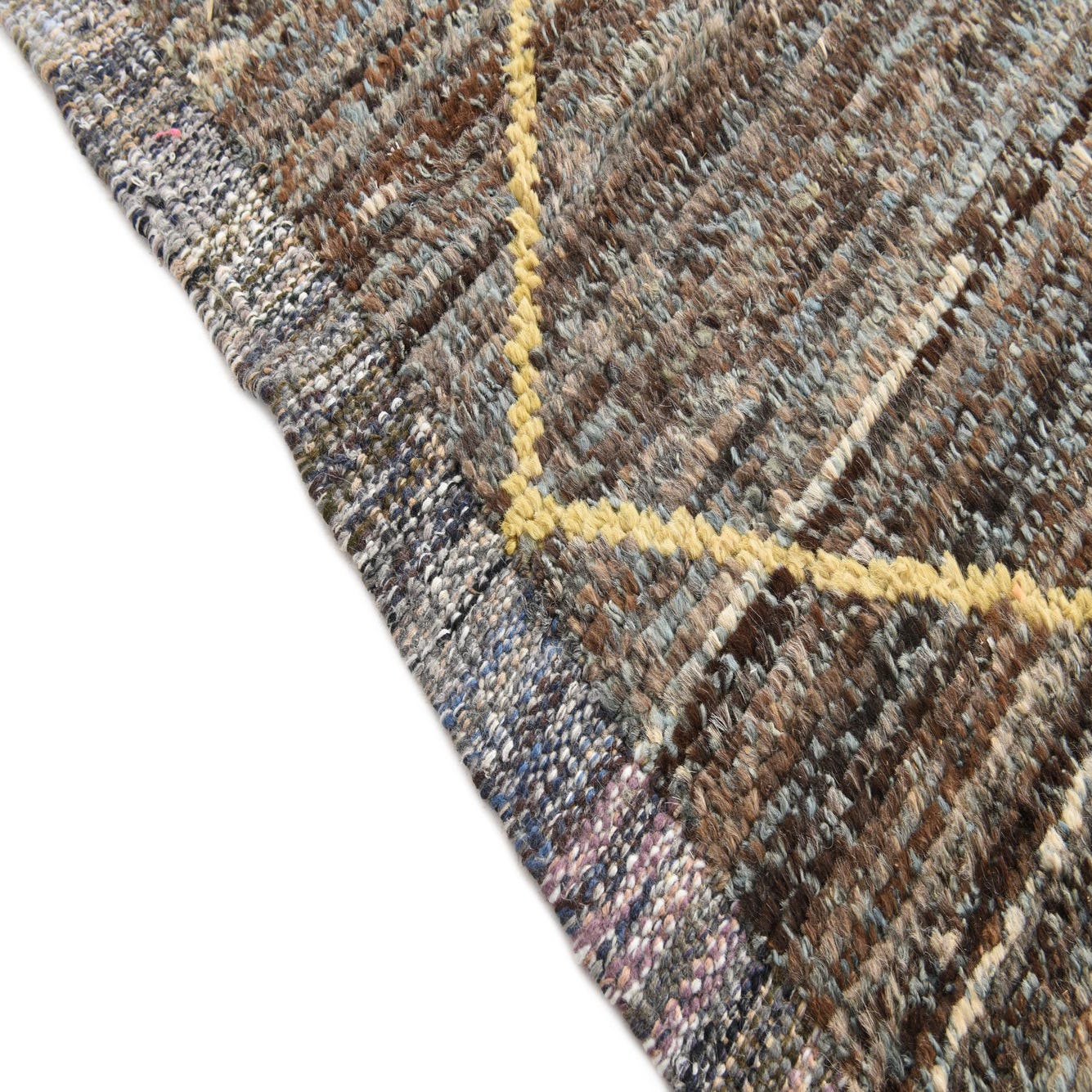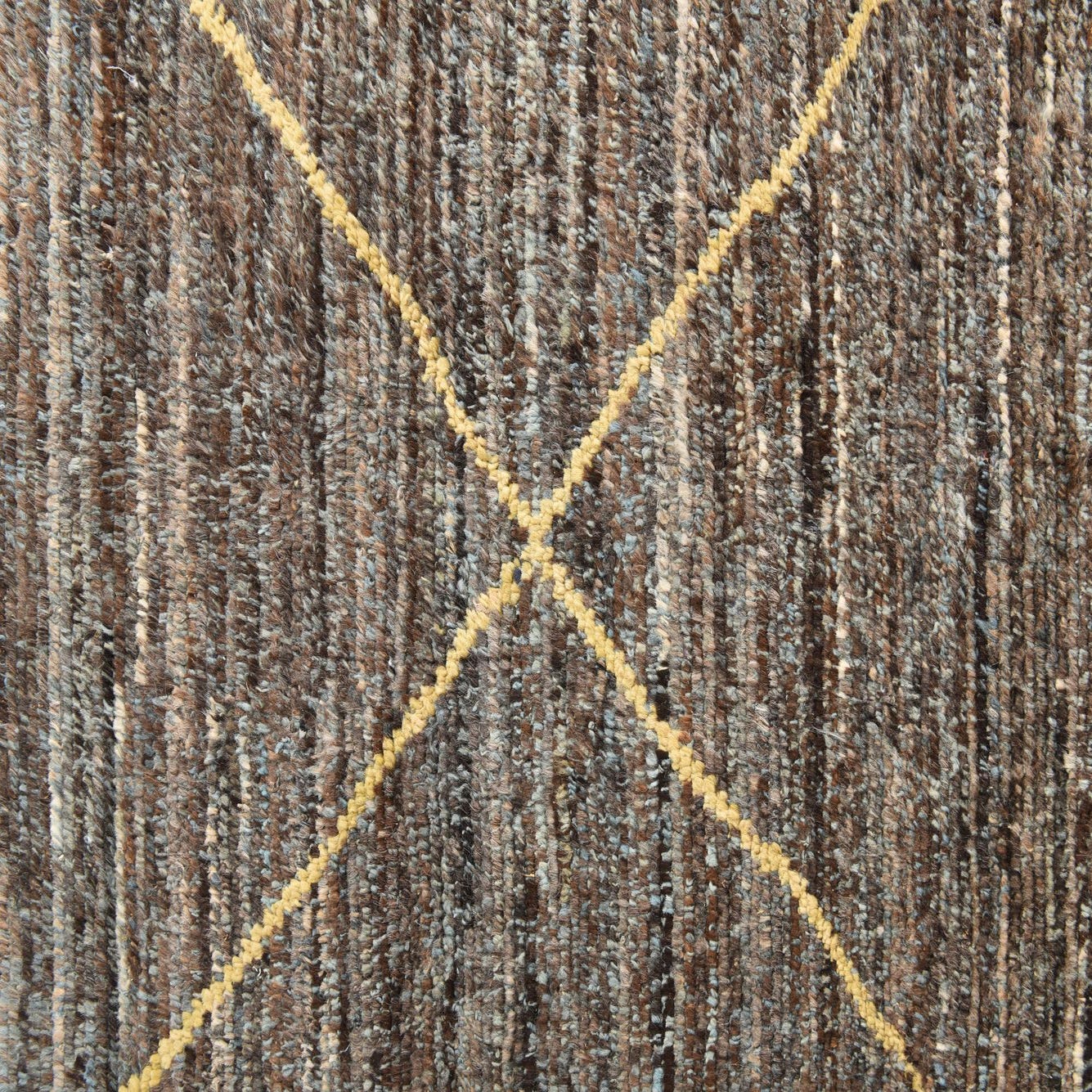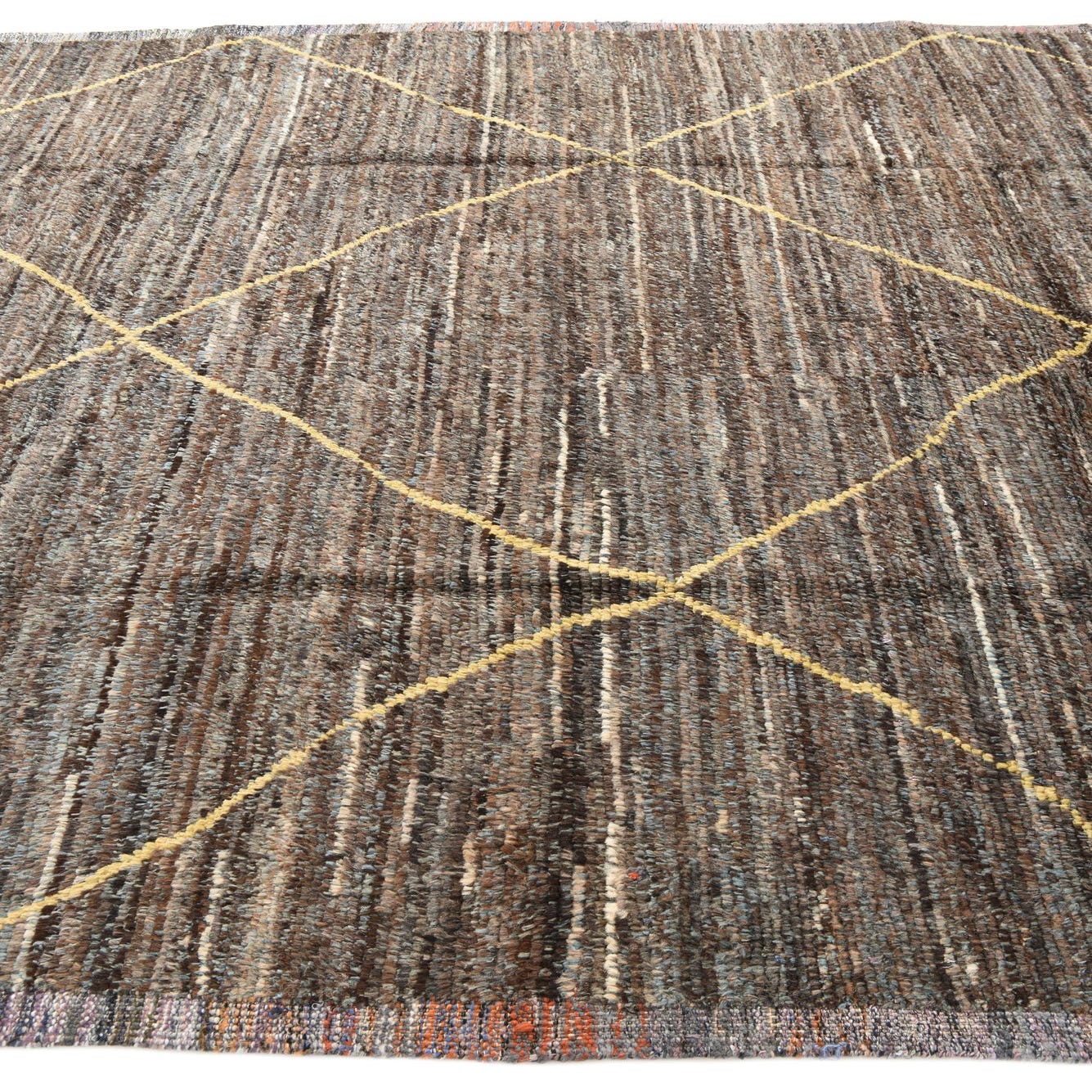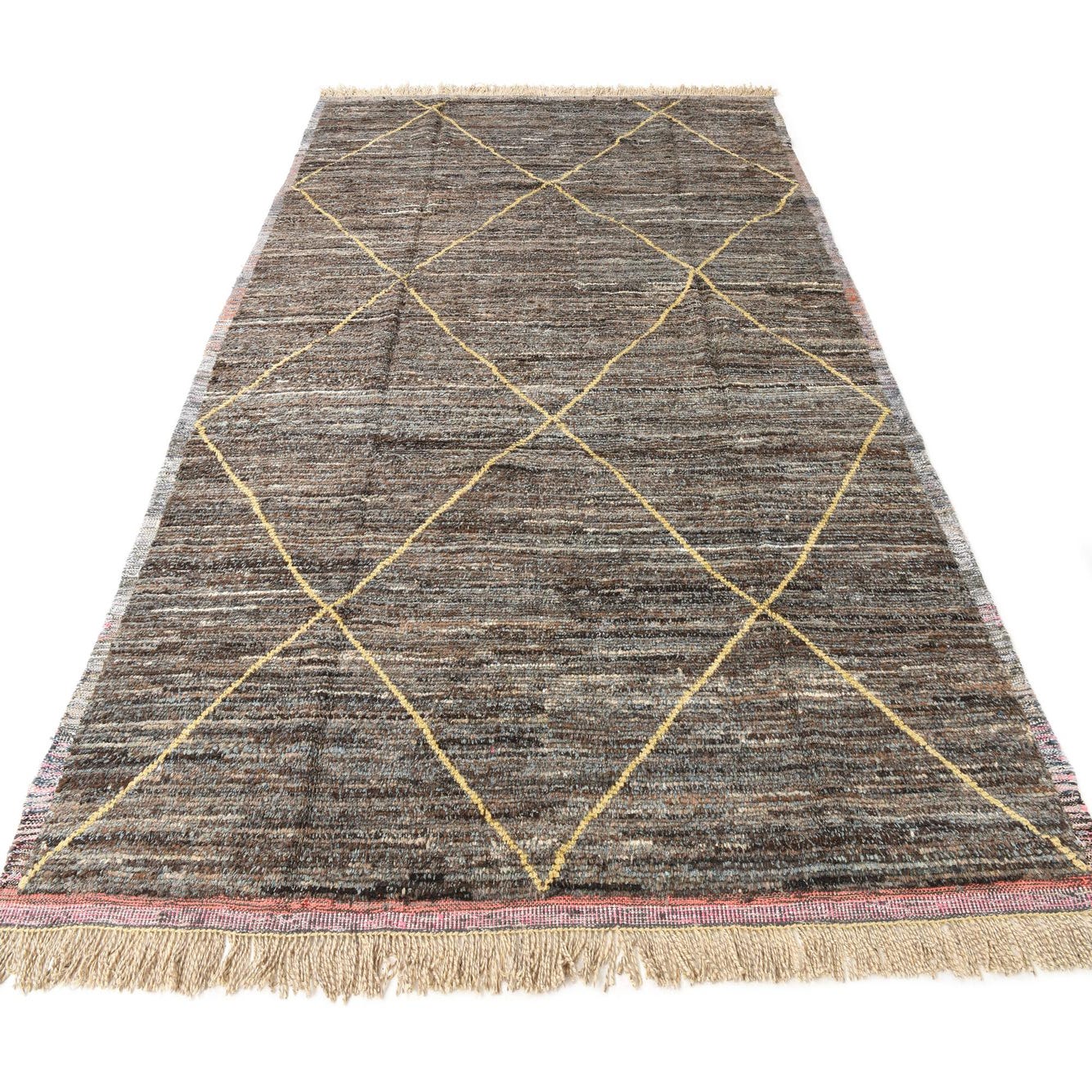 A rectangular 8x11 brown Moroccan shag rug with a yellow tribal diamond pattern and fringe.