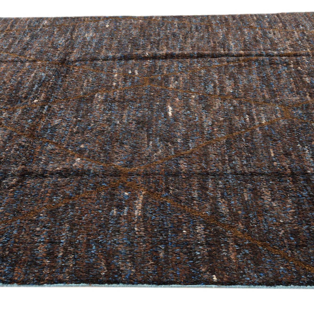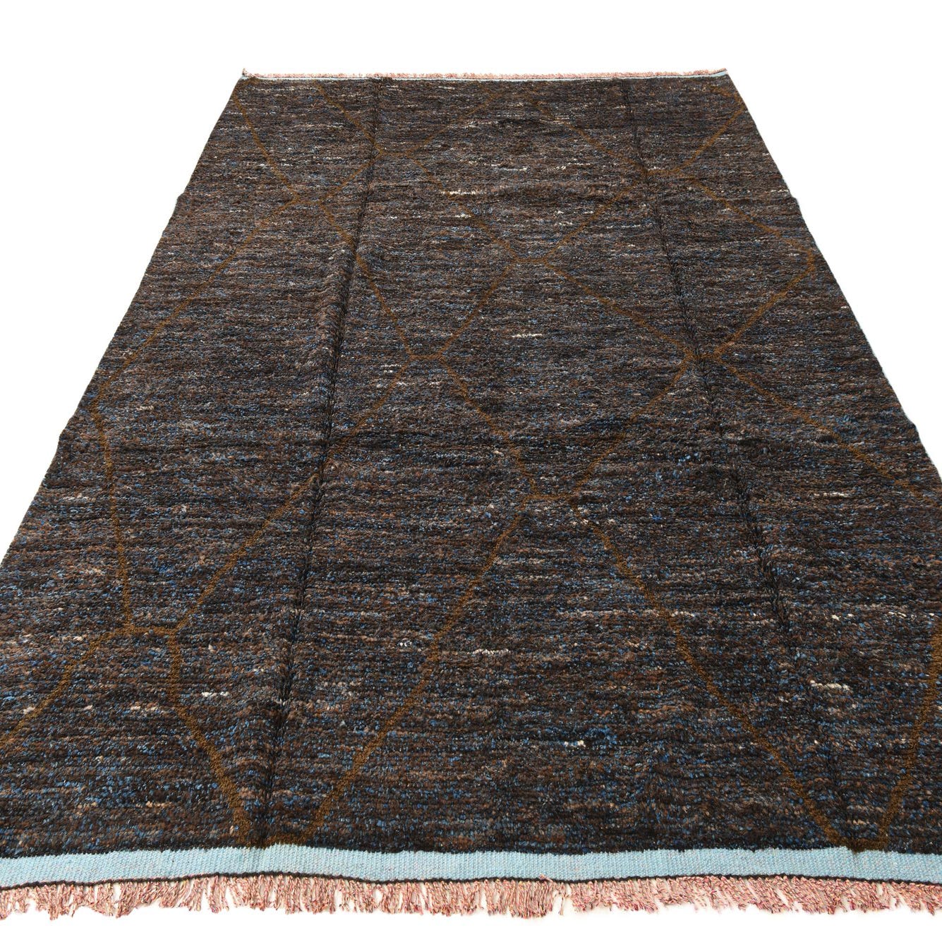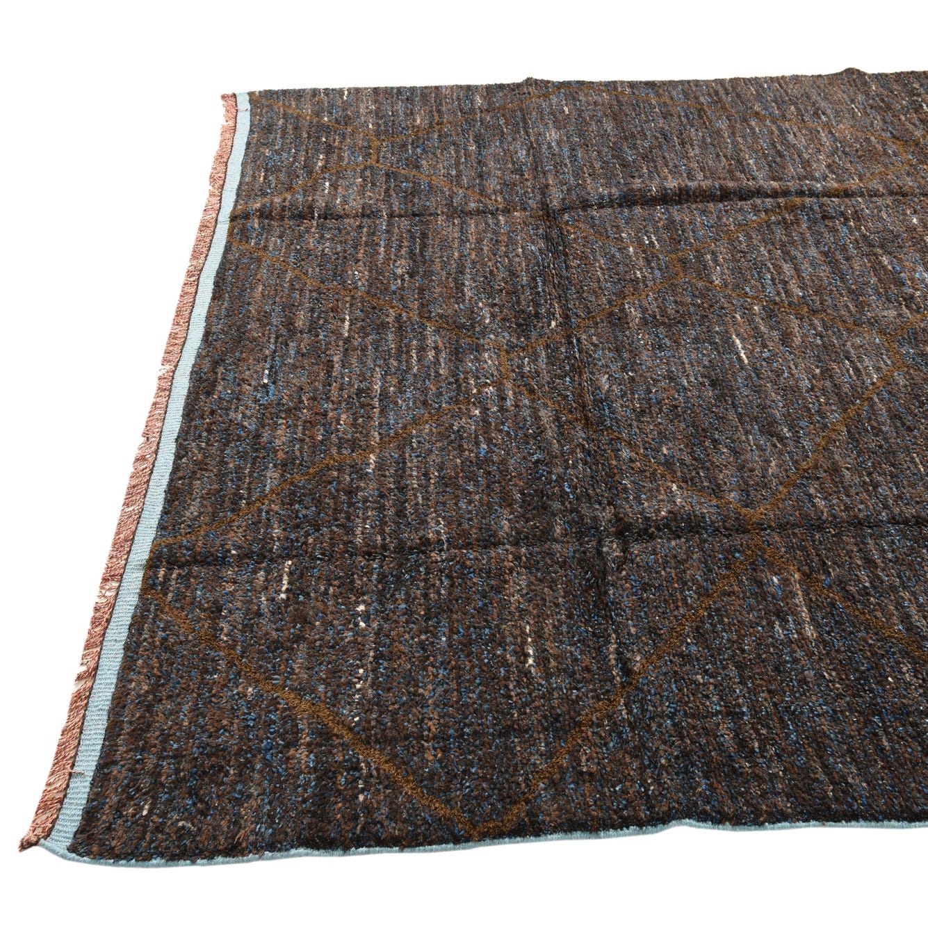 Hand-knotted from 100% wool, this rug has a low, slightly uneven pile with a tactile, handcrafted feel underfoot. A deep brown field provides a warm, grounded backdrop while subtle flecks of blue and ivory create depth across the surface. A faint diamond lattice is woven in a close tonal brown that adds geometric interest without overpowering the palette. The short fringed ends show soft pink tassels and a narrow blue edge that offer a quiet, unexpected touch of color.